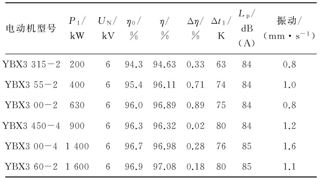 试制了6个典型规格的电动机,其性能参数见表4。其中,P1为额定功率;UN为额定电压;η0为效率考核值,即GB 30254—2013《高压三相笼型异步电动机能效限定值及能效等级》中的1级能效等级;η为效率试验值;Δη为效率试验值与考核值差值;Δt1为温升;Lp为噪声声压级。由试验数据可知,YBX3系列电动机效率试验值全部超过了GB 30254—2013《高压三相笼型异步电动机能效限定值及能效等级》中的1级能效等级,同时达到了低噪声、低振动的设计要求,综合性能达到国内领先水平。