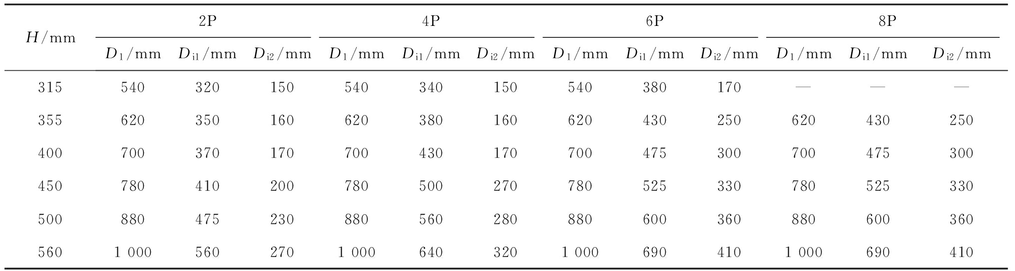 “三圆”尺寸是指电动机的定子外径、定子内径和转子内径,决定了电动机的有效材料和关键性能。“三圆”尺寸的确定是电动机设计的关键。由于YBX3系列电动机为1级能效,同功率电动机又比YX2系列电动机降低1个中心高,所以其“三圆”尺寸设计考虑了放大尺寸,并且在YX2系列电动机的基础上进行优化调整,最终确定YBX3系列电动机的“三圆”尺寸,见表2,其中D1,Di1,Di2分别为定子冲片外径、定子冲片内径,转子冲片内径。