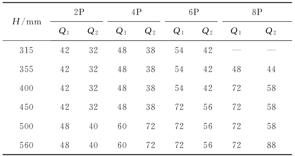 在YX2系列电动机基础上进行优化调整,选取YBX3系列电动机的槽数配合,见表1,其中H为中心高,Q1,Q2分别为定子、转子槽数。