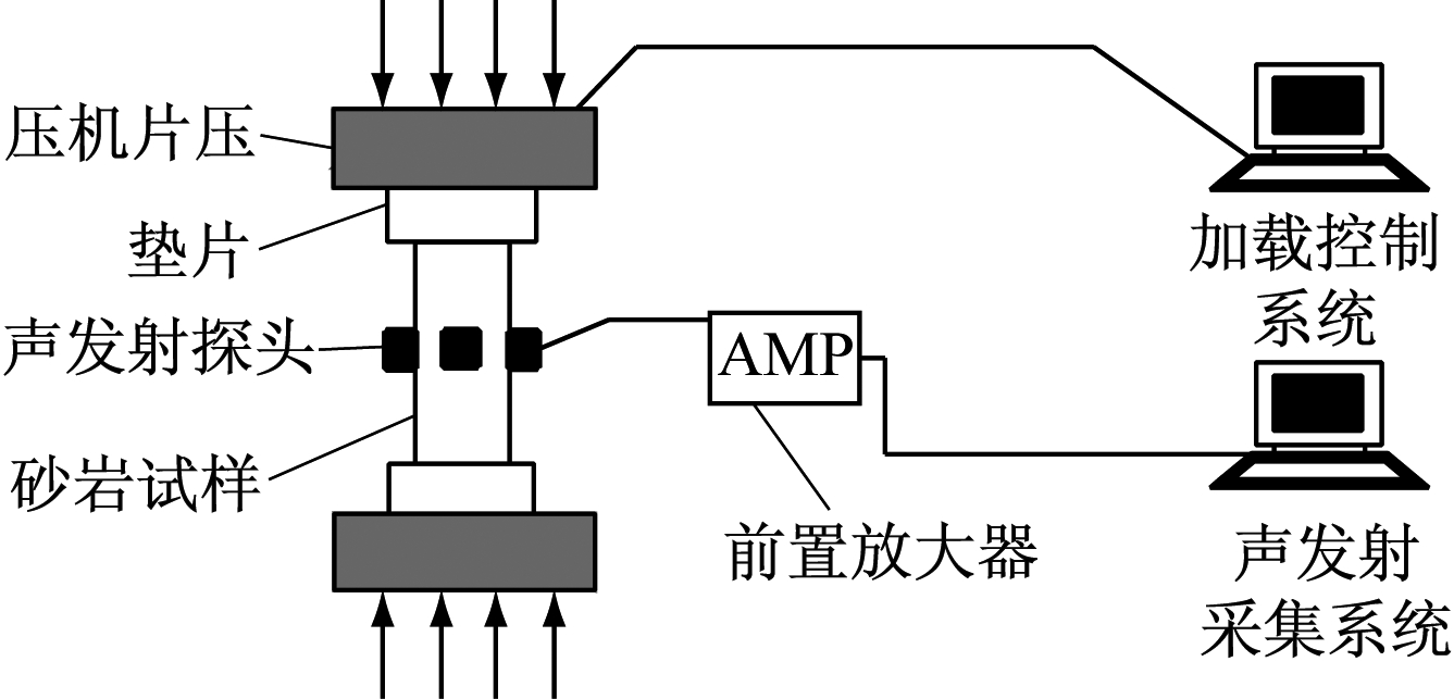 岩石、混凝土等含有空隙的材料在外部载荷作用下,内部会发生裂纹闭合、发展及贯通,直至破坏,在这个过程中会产生声发射现象。砂岩作为一种多孔介质材料,在外载荷作用发生破坏的过程中也会产生声发射现象。前人对岩石破裂过程中所产生的声发射特性已做了不少研究。陈依珂等[1]对砂岩在单轴压缩过程中产生的声发射信号进行了研究,发现声发射信号变化和力学参数具有很好的一致性;姜永东等[2]通过砂岩单轴压缩试验得出,砂岩在加载破坏过程中产生的声发射信号具有分形和混沌特征;李博等[3]研究了砂岩在单轴压缩过程中声发射信号关联维数与应力之间的关系,得出关联维数随应力增加而降低的结论;张黎明等[4]通过对大理岩三轴加压试验发现在岩样破坏前塑性阶段存在平静期;陈宇龙等[5]通过砂岩单轴压缩试验得出了全应力-应变曲线4个阶段中的声发射特征;尹贤刚等[6]研究了岩石加载过程中分形维数特征,得出了分形维数在声发射平静期阶段达到最低,预示着岩石破坏的发生。虽然声发射技术在岩体监测方面的应用已取得不少成果,但相对于整个破坏过程而言,时间序列各个阶段声发射特征的响应规律与砂岩破坏演化过程的关系却尚未进行详细研究。深入研究砂岩破坏演化过程,分析演化过程时间序列各个阶段声发射信号的响应规律,对于提高砂岩相关工程预警准确性有着非常重要的理论和现实意义。
