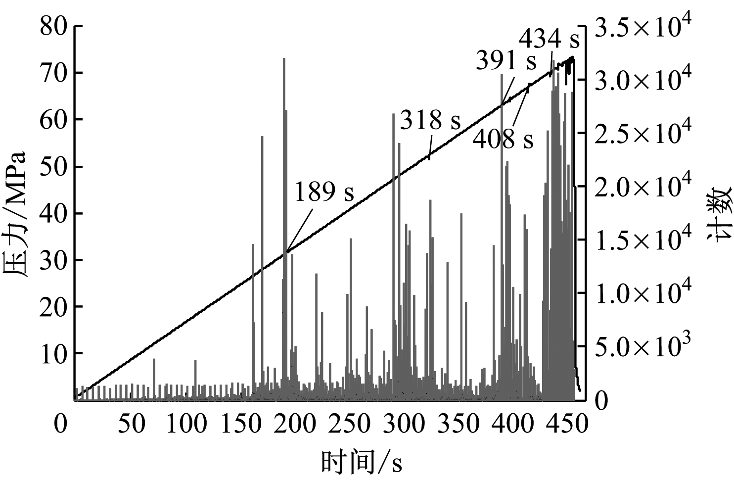 图3、图4分别为2号、3号组砂岩破坏过程的应力-应变曲线及声发射计数时间柱状图。从图3、图4中可以看出,OA段为原始压密阶段(2号试样0~63 s,3号试样0~28 s),在外部载荷作用下,砂岩中的原始孔隙和裂隙逐渐压密变实,此时期声发射信号强度较弱。AB段为弹性阶段(2号试样63~319 s,3号试样28~185 s),随着外部载荷的逐渐增大,砂岩内部裂纹稳定发展,应力-应变曲线呈直线上升状,此阶段中砂岩声发射信号较前一时期较为活跃。其中2号试样在189,318 s,应力峰值的41.7%,70%处,3号试样在136,163 s,应力峰值的52.5%,63.1%处,分别发生了一次微破裂,相应的声发射计数也各出现了极大值。BC阶段为塑性阶段(2号试样319~448 s,3号试样185~250 s),曲线增长速度减缓,此时内部裂纹逐渐扩张直至强度峰值,试样遭到破坏,声发射信号强度在此期间也发展到最强,并且在2号试样391,408,434 s,应力峰值的87.1%,89.5%,96.6%处及3号试样198,219,228 s,应力峰值的75.7%,83.4%,84%处都发生了较大破裂,同时,声发射计数值也再次得到了响应,达到了极值。C点以后为峰后破坏阶段,试样起初仍有一定的承载能力,但随着应力的增大,承载能力逐渐丧失,伴随产生的声发射信号也逐渐变弱。综上所述,可以看出在砂岩加载破坏过程中产生的声发射信号与砂岩内部裂纹的闭合、产生及发展有很好的对应关系。