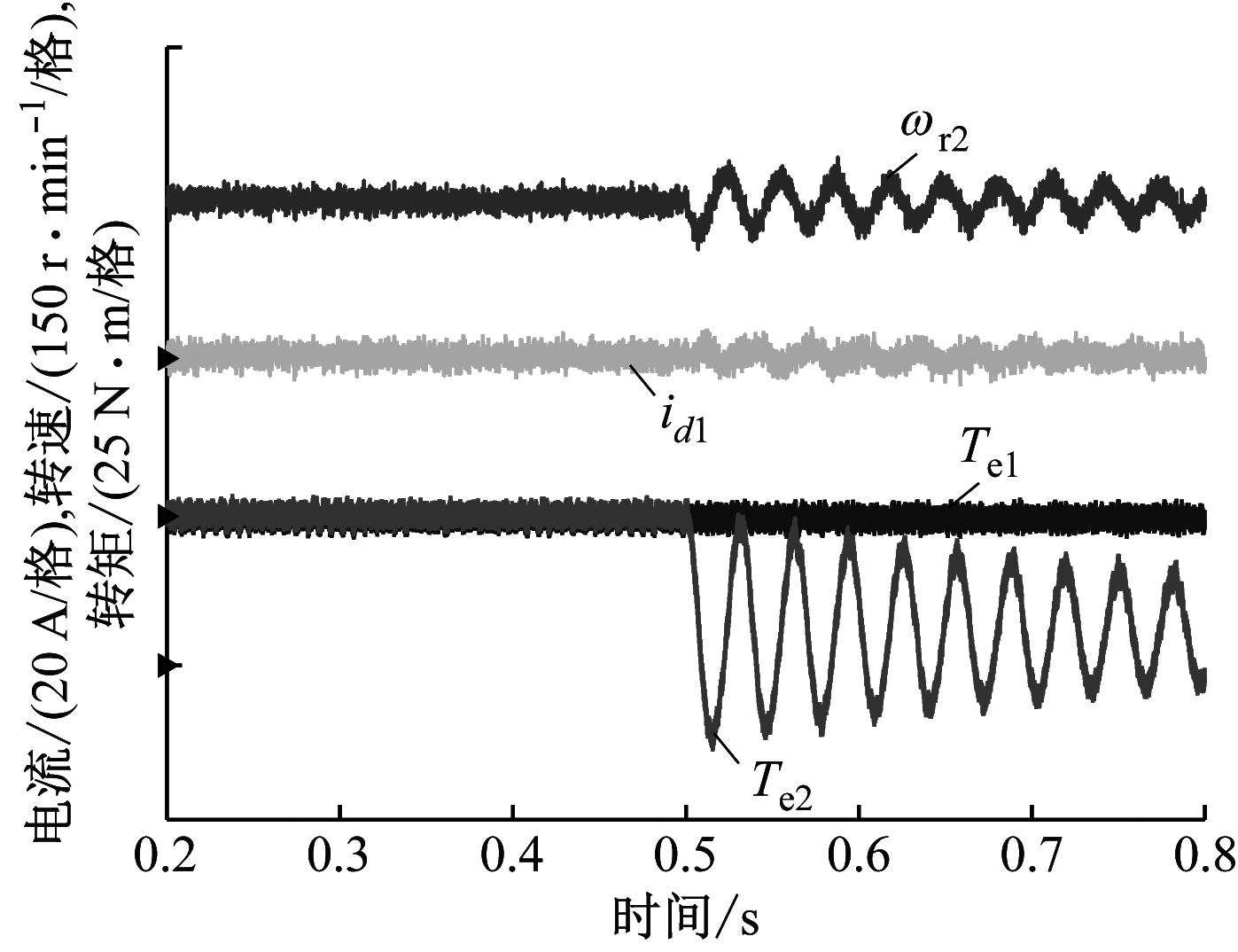 MRR摆臂驱动系统动态实验结果如图8所示。1号主电动机保持空载特性不变,2号从电动机输出转矩Te2在0.5 s时由0突增为20 N·m。可看出,未采用有源阻尼控制方法时,Te2突变会引起2号从电动机角速度ωr2、1号主电动机电流d轴分量id1出现大幅度多周期振荡。虽然MRR摆臂驱动系统自身的阻尼特性最终可使Te2稳定,但是振荡周期过长(10个基波周期以上),造成MRR摆臂驱动系统动态失稳。采取有源阻尼控制方法后,Te2突变后,ωr2,id1收敛时间更短,扰动持续时间小于0.1 s(1~2个基波周期)。可见有源阻尼控制方法可有效提高MRR摆臂驱动系统的动态收敛特性。