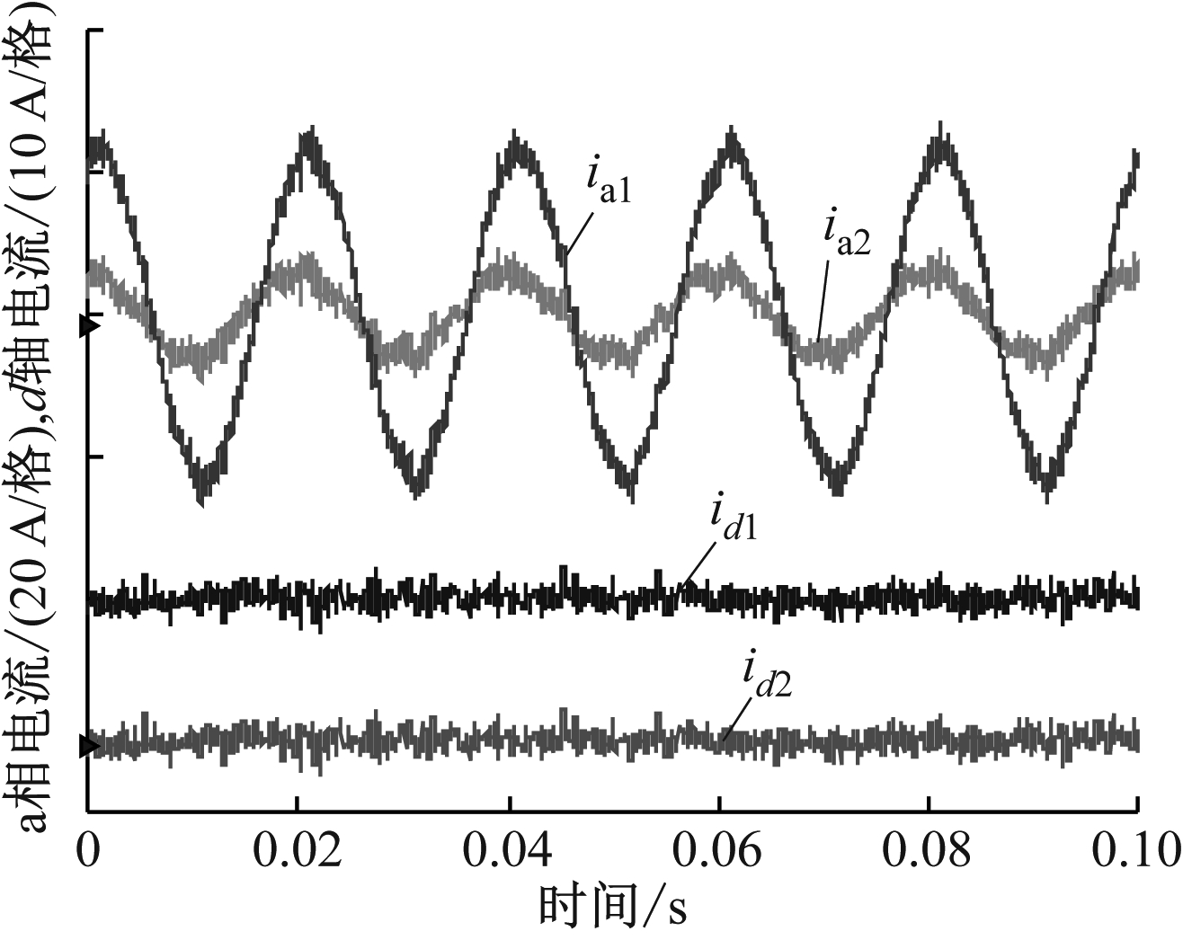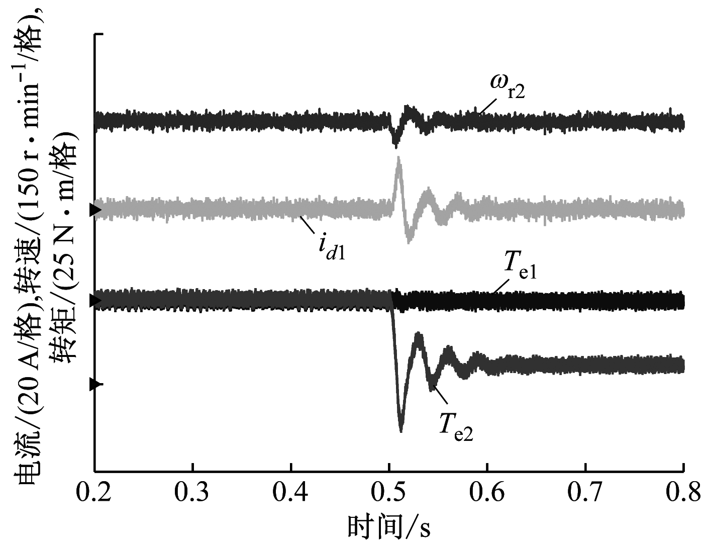 MRR摆臂驱动系统稳态实验结果如图7所示。1号主电动机a相电流ia1幅值较大,约为25 A。2号从电动机a相电流ia2幅值较小,约为8 A,二者频率均为50 Hz。可见在单逆变器驱动下,MRR摆臂驱动系统双电动机电流幅值不同、频率一致,即可在负载不平衡状态下运行于同一转速。1号主电动机电流d轴分量id1=10 A,2号从电动机电流d轴分量id2=0,可见在稳态情况下,id1不为0,其调节得到的10 A电流用于完成对2号从电动机的转矩控制。