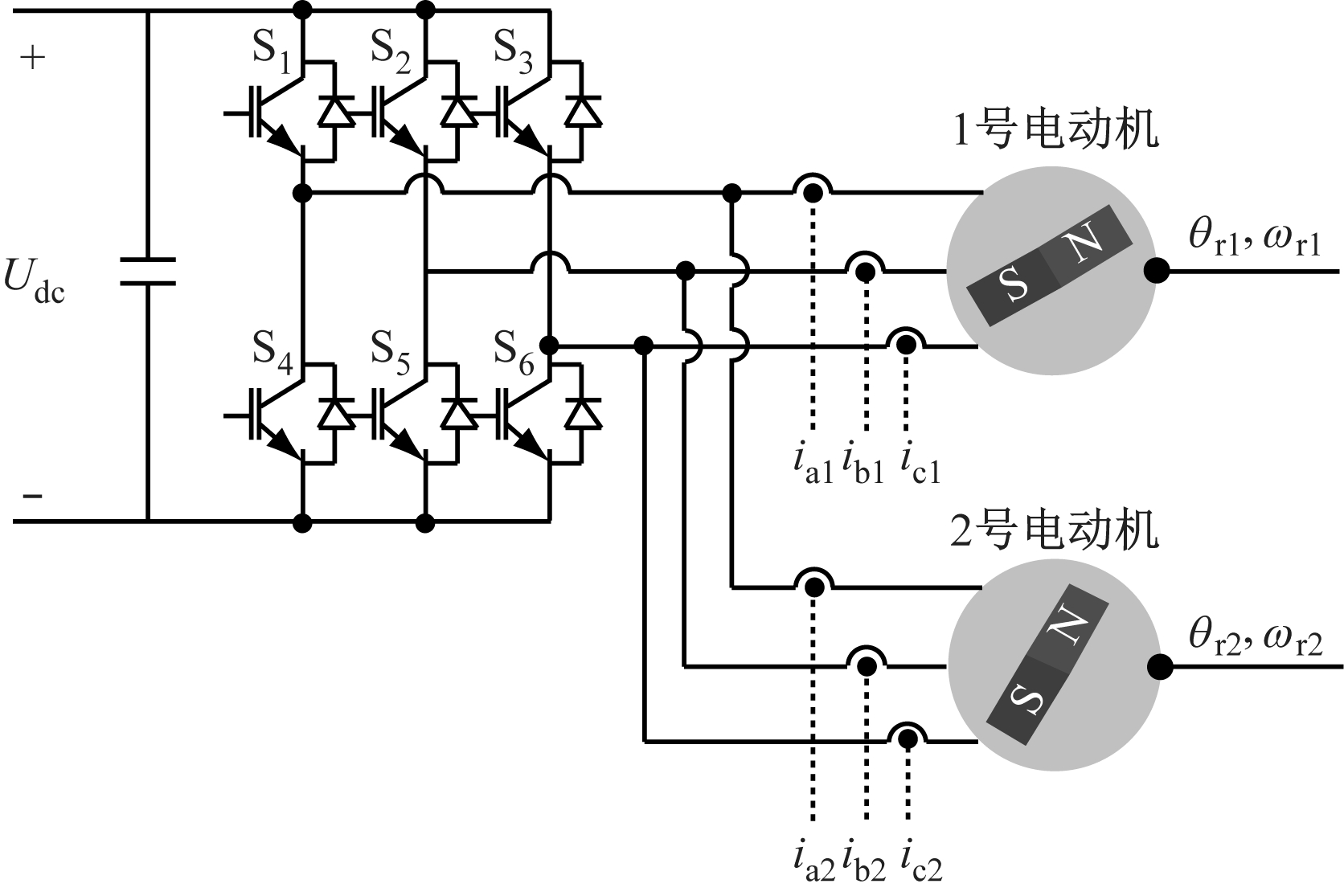 单逆变器双电动机MRR摆臂驱动系统模型如图1所示。逆变器主电路拓扑采取三相电压源逆变器结构,直流母线电压为Udc。S1—S6为开关器件。MRR的2个摆臂均由永磁同步电动机驱动,其三相电流分别为ik1,ik2(k=a,b,c),转子位置角度分别为θr1,θr2,转子角速度分别为ωr1,ωr2。