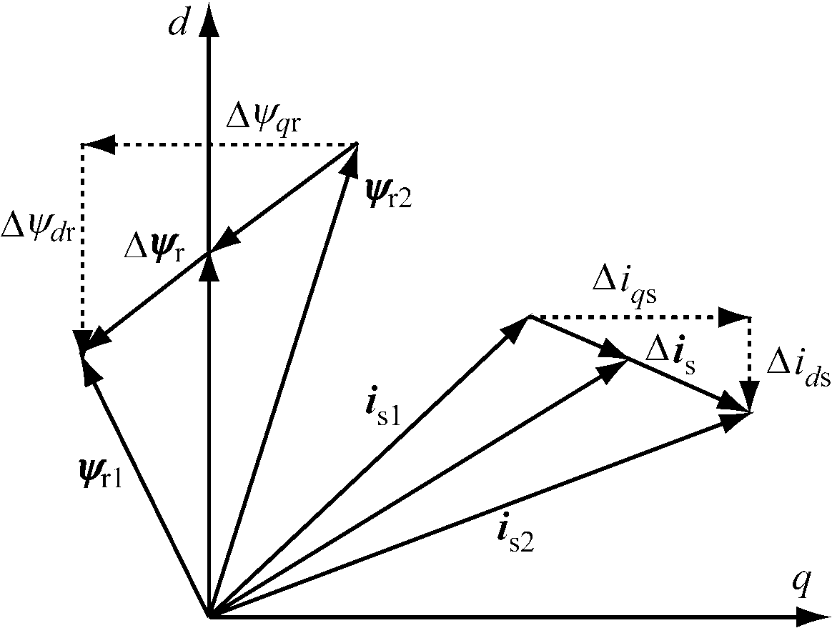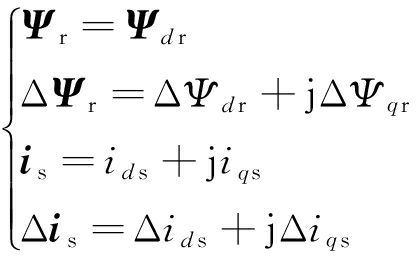 考虑到运行过程中各摆臂运行状态具有差异性,摆臂驱动系统的电压、电流、磁链等均存在一定误差,如图2所示。Ψr1,Ψr2分别为MRR摆臂驱动系统1号、2号电动机磁链,ΔΨr为双电动机磁链误差,ΔΨdr,ΔΨqr分别为双电动机磁链误差d轴、q轴分量,is1,is2分别为1号、2号电动机电流,Δis为双电动机电流误差, Δids,Δiqs分别为双电动机电流误差d轴、q轴分量。