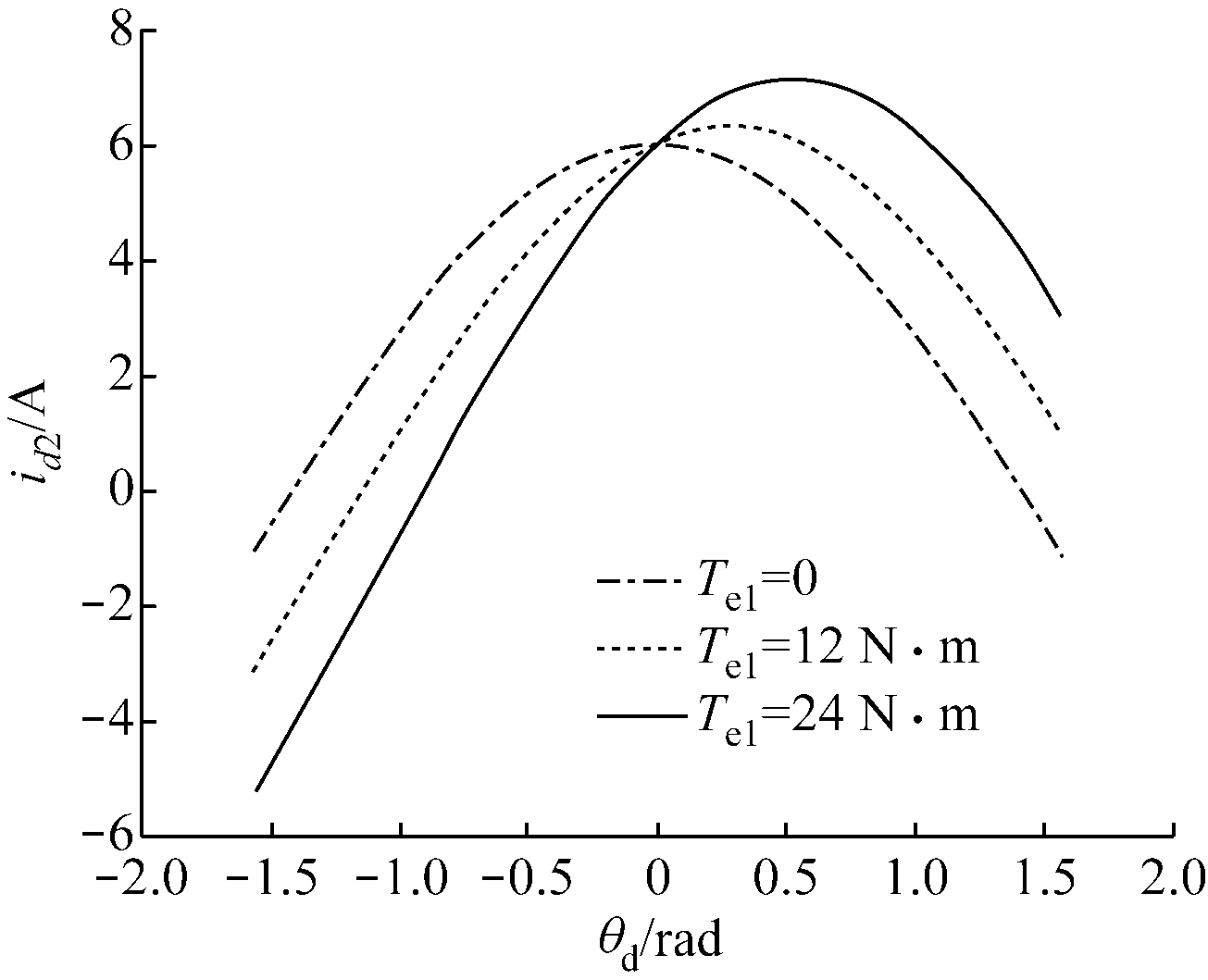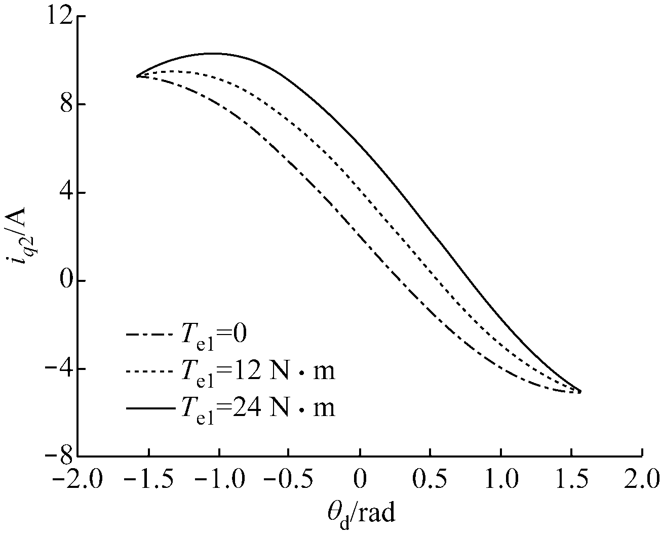 从式(10)可看出,2号从电动机电流d轴、q轴分量独立于电动机加权角速度ωr,且仅与1号、2号电动机转子位置角度差θd有关。设1号、2号电动机均为15 kW永磁同步电动机,其设计参数一致:额定转速为750 r/min,极对数为4,永磁体磁链为1 Wb,定子电感d轴、q轴分量分别为0.6,1.2 mH。1号主电动机输出转矩分别为0,12,24 N·m,2号从电动机空载时,2号从电动机电流如图3所示。可看出1号主电动机负载不同时,2号从电动机电流d轴分量id2随θd增大呈先增大后减小趋势,q轴分量iq2随θd呈逐渐减小趋势。可见,1号主电动机负载不同,使得2号从电动机耦合出不同的d轴、q轴电流分量。在双电动机转子位置角度差θd一定时,通过调节1号主电动机电流d轴、q轴分量,可实现对2号从电动机电流d轴、q轴分量的控制,从而调节2号从电动机输出转矩。