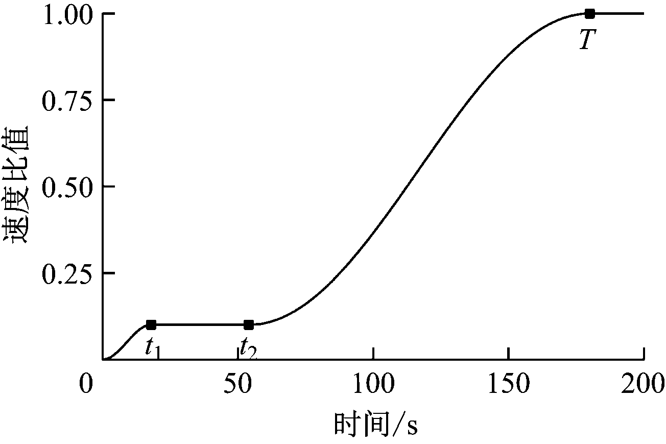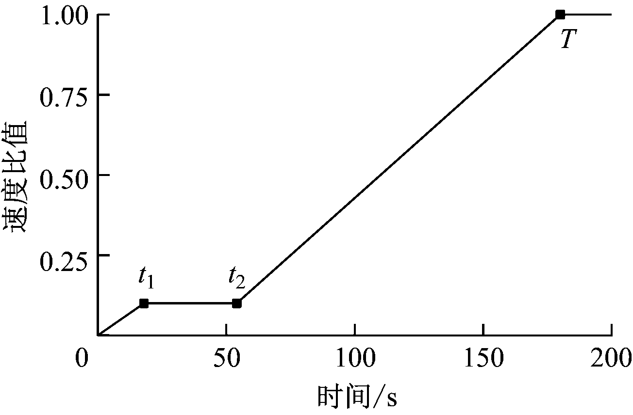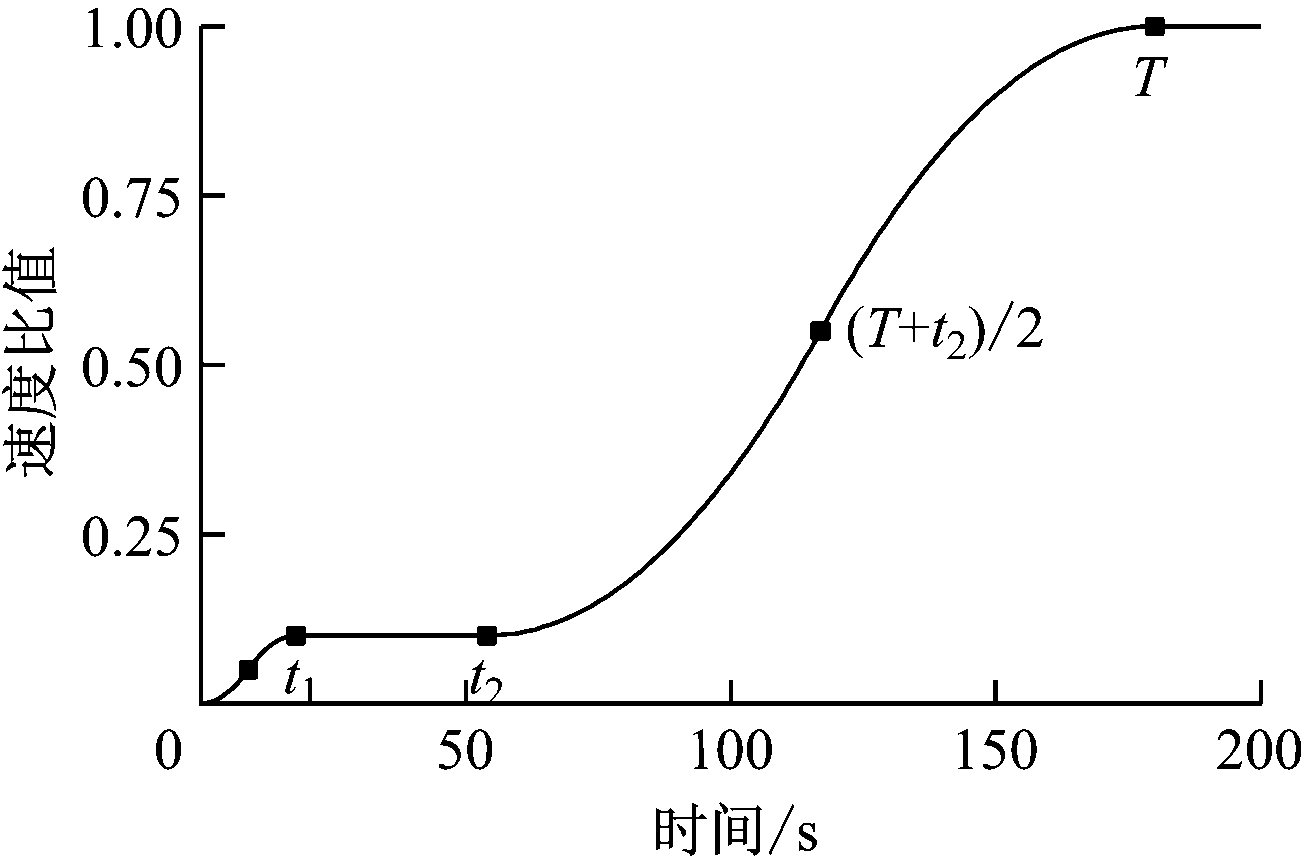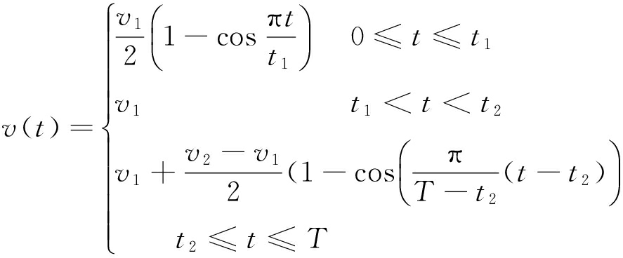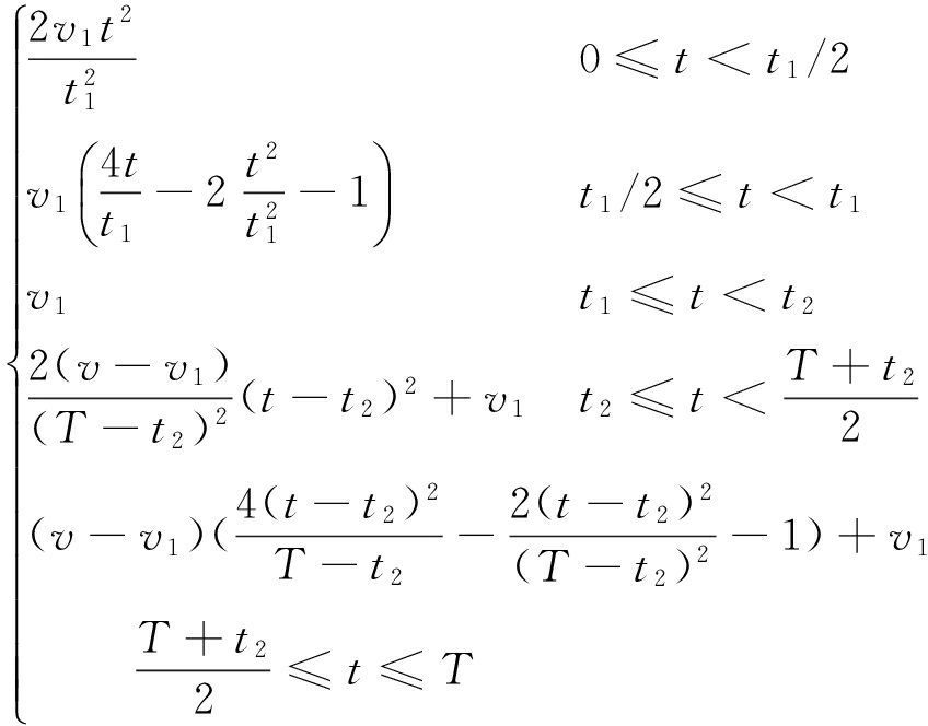 式中:t1为到达爬行端的时间,t1=T/10;t2为爬行段结束时间,t2=3T/10;v1为延迟段带速;v2为额定带速,v1=v2/10。