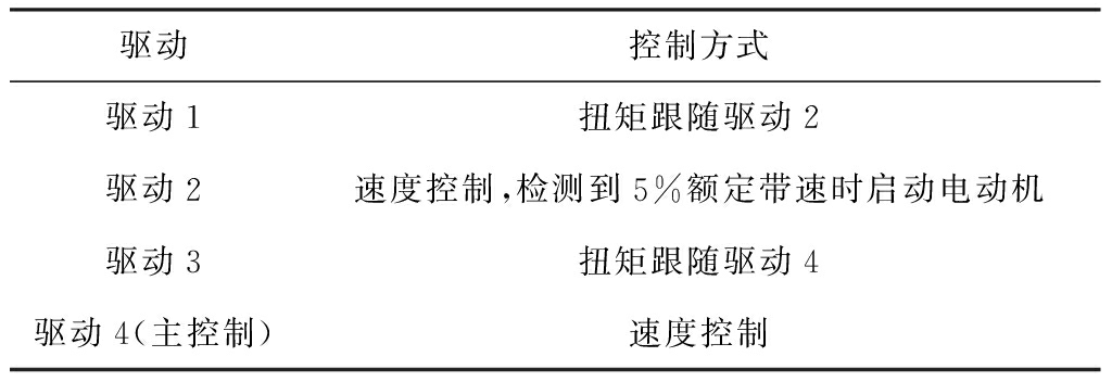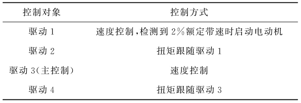 不同于单电动机的带式输送机,该带式输送机要实现各电动机功率平衡,保证驱动滚筒不发生打滑。针对这些问题,将头部驱动和中部驱动分开,组成2个系统。采用双驱动主从控制,实现从动电动机扭矩跟踪主电动机。为了避开电动机同时启动对电网的冲击,设置头部驱动先开启,当速度波传递到中部时,卸载驱动再开启。在控制器中加入带速检测,当带速大于设定速度vs时卸载电动机启动。制定2种控制方案,见表1、表2。