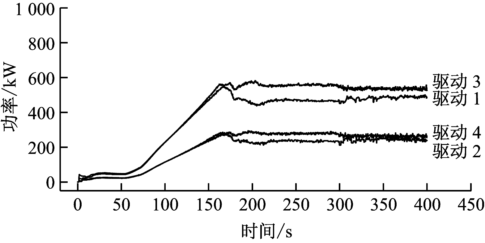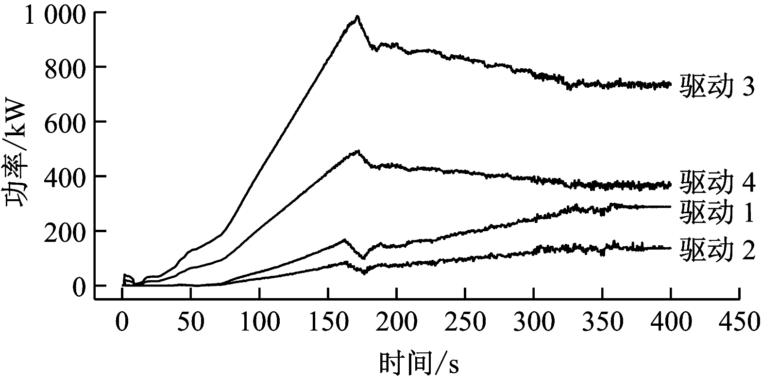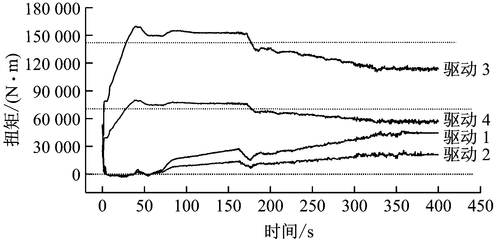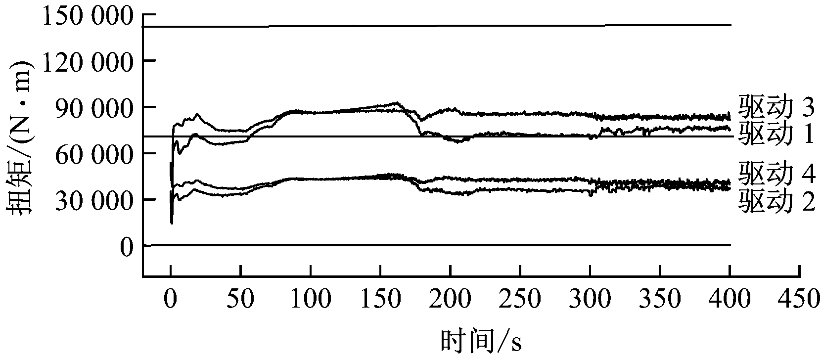 电动机输出扭矩如图3所示。方案1中,中部电动机启动前由输送带拖动,出现负扭矩,头部电动机输出扭矩超过满载转矩;方案2采用扭矩跟踪使驱动1和驱动2达到同步,驱动3和驱动4达到同步,解决了电动机之间的干涉问题。