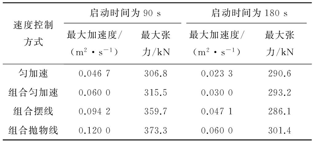 比较启动时间为90 s与180 s的情况可知,延长启动时间可以使输送机最大张力减小,输送机动载荷下降,所以启动时间不宜设置过短。启动时间为90 s时,匀加速启动的输送带张力最小,组合抛物线方式的张力最大,说明当启动时间较短时,启动过程中的加速度最大值起到主要作用。组合抛物线方式的加速度最大,所以,输送带张力最大。启动时间为180 s时的仿真结果和90 s略有差别,组合摆线启动方式的输送带张力最小。启动时间较长时,加速度最大值影响变小,加速度突变也影响仿真结果,组合摆线加速度突变最小。输送带具有弹性,当启动时间足够长时,加速度变化率的增大对动载荷的影响不大,所以,几种启动方式的输送带张力接近。