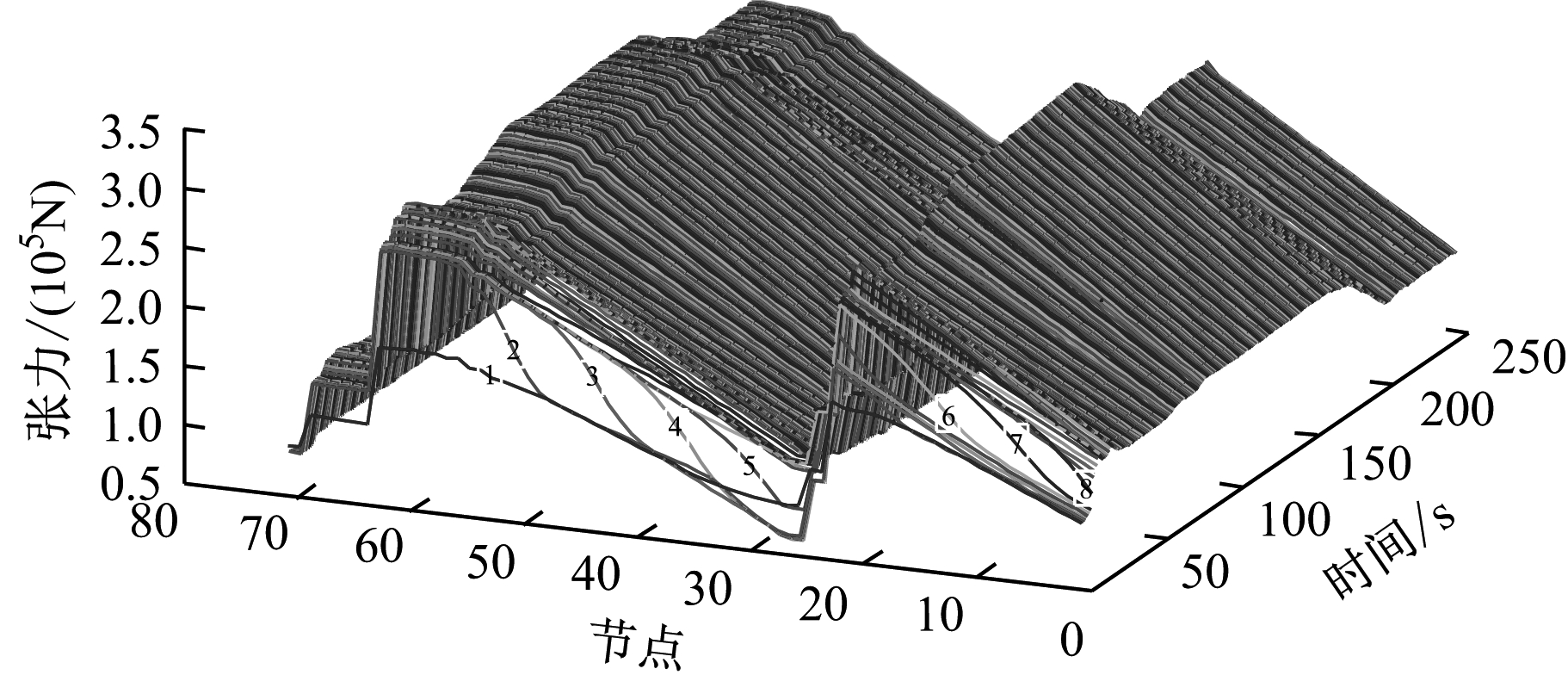 将时域离散,以1 s为间隔,从尾部沿着输送机运送方向到驱动4共71个节点输送带张力如图4所示。方案1的最大张力为490 kN,集中在输送机头部。方案2的最大张力为320 kN,2个波峰分别是中部驱动和头部驱动所在位置。从标记的数字可以看出前8 s的张力变化,头部驱动启动后,经过5 s,张力传递到中部。