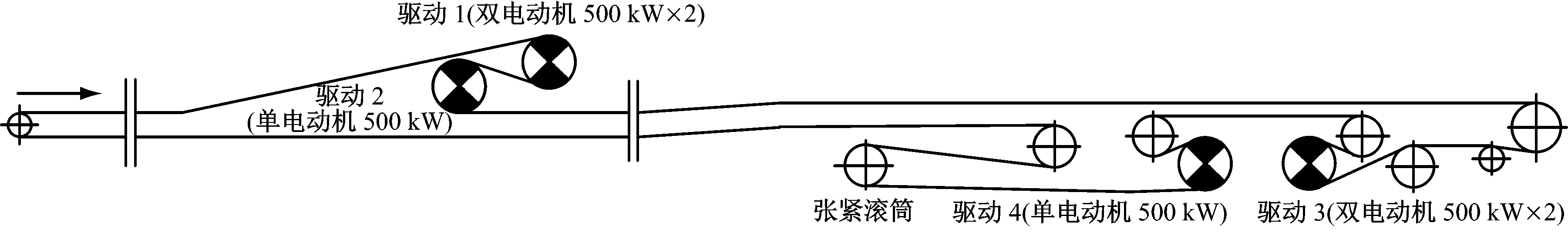 在输送机调试之前,需要初步制定启动控制方案,以内蒙古某煤矿使用的中间卸载式带式输送机为例进行分析,其布置简图如图1所示。该带式输送机水平长度达到5 060 m,提升高度为4.7 m,运量高达3 000 t/h,带速为4.2 m/s,采用带宽为1.4 m的PVC2500S型输送带;采用卸载式滚筒中间驱动技术,3 000 kW输送功率平均分配在中部和头部驱动,共6台电动机,每台功率为500 kW;驱动1和驱动2布置在输送路线中部,驱动3和驱动4布置在头部,驱动部分采用永磁电动机直驱系统。