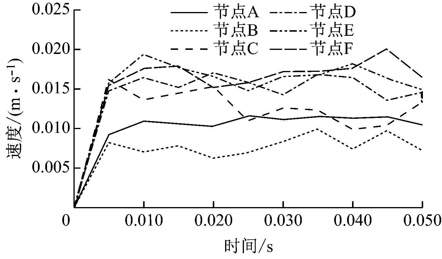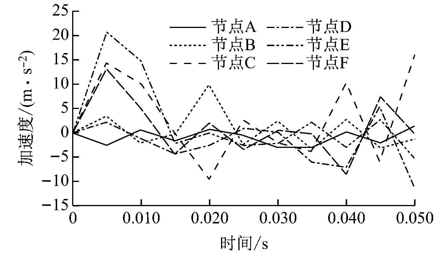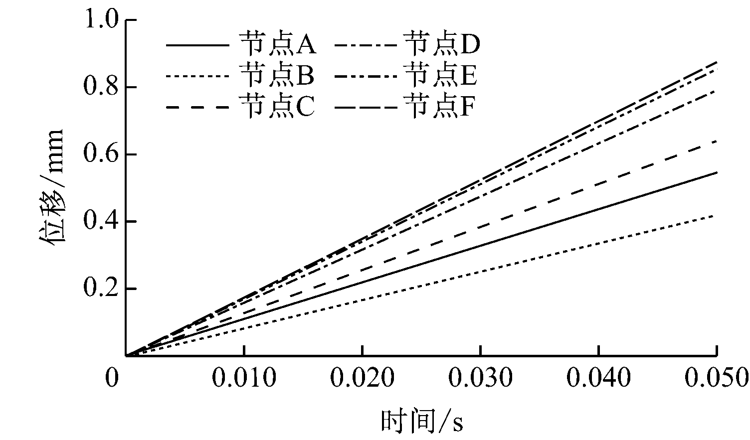 为了进一步分析接触区域在0.05 s内速度、位移和加速度的变化情况,在2个圆环链接触部分选取6个节点进行分析[10]。各节点的速度、加速度和位移变化如图4所示。由图4(a)可以看出,在2个圆环链受到瞬间碰撞后,链环出现波动现象,最大的速度为0.022 m/s,发生在0.045 s,这使得两链环在接触区域发生摩擦;由图4(b)可以看出,链环加速度处于波动状态,呈现起伏性变化,表明链环碰撞过程处于振动状态,长时间会产生疲劳并导致断裂;由图4(c)看出,最大位移为0.88 mm,2个圆环链的接触属于面-面接触,其接触面产生相对摩擦运动,这说明摩擦会导致圆环链之间产生位移,从而发生变形,影响圆环链的质量[11]。