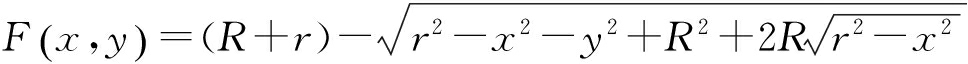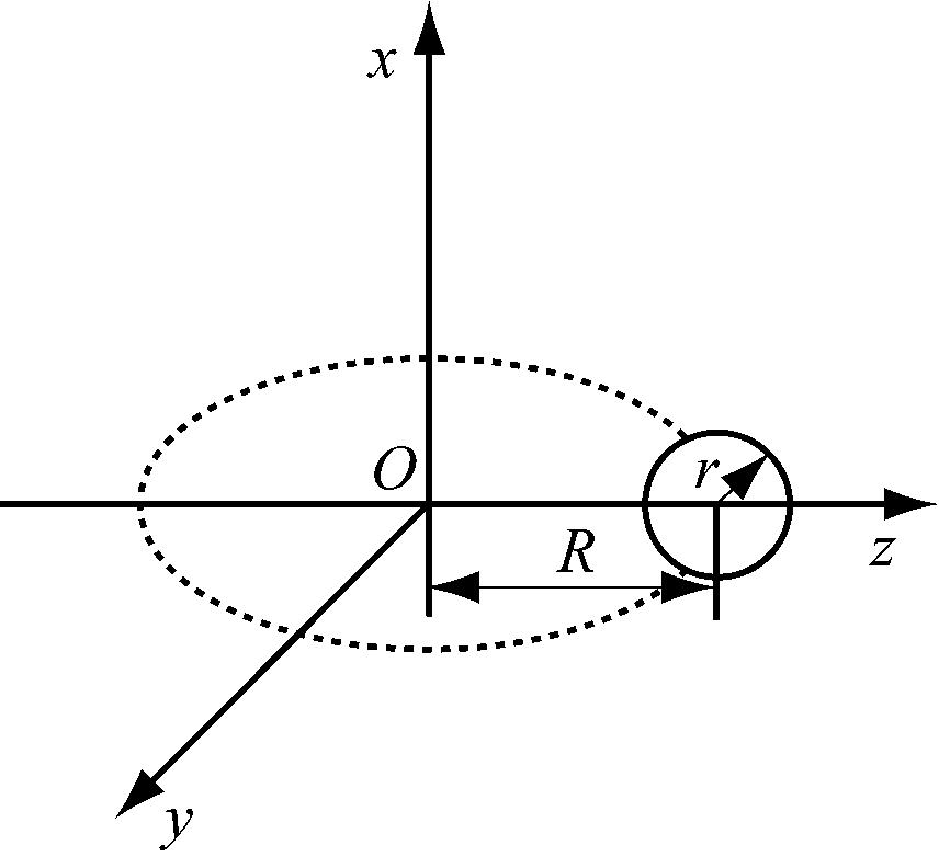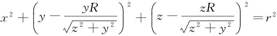 建立圆环链空间数学方程。圆环链圆弧段曲面形成的坐标系如图1所示,以原点为圆心,取距原点长度为R,画半径为r的圆[7]。绕x轴旋转而成的圆环方程为