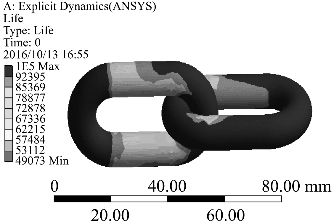 通过ANSYS Workbench对圆环链进行疲劳寿命预测,查阅相关资料模拟出材料的S-N曲线,对左侧圆环链施加一固定约束,右侧圆环链施加76 kN的力,圆环链按正弦规律加载动态载荷,通过计算得到圆环链的寿命云图,如图5所示。