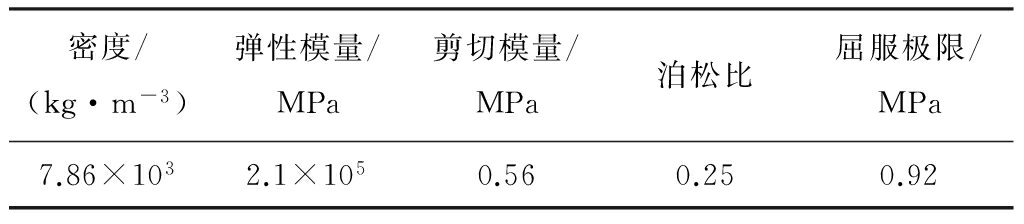选择φ10×40圆环链为研究对象,圆环链材料选用23MnNiCrMo,材料参数见表1[8]。运用三维软件CATIA建立圆环链模型,将模型导入至ANSYS LS-DYNA中进行有限元分析。然后定义圆环链的接触为面-面接触,进行网格划分,如图2所示。对有限元模型施加边界条件和载荷,假定左圆环静止,在其左侧弯臂内部施加一固定约束,右环整体施加沿x轴正方向的速度,大小为0.5 m/s,设置模拟时间为0.05 s,进行计算分析。
