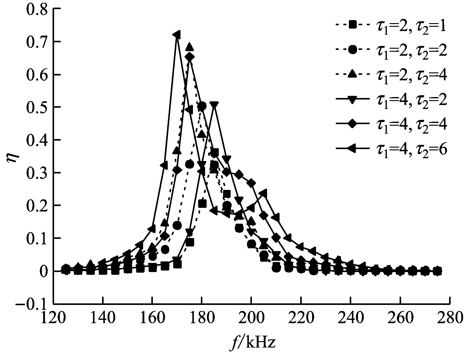 时取得最大值。由前面的分析可知,系统输出功率在τ1=τ2处取得最大值,由此可知,随τ2增大,系统首先获得传输效率最大值,而后获得输出功率最大值;随τ2增大,系统传输效率出现了分裂,即有2个效率峰值,但受τ3的影响,高频效率峰值下降明显,如τ1=4,τ2=6时的实验数据曲线。