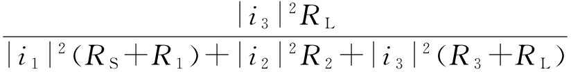 将式(4)和式(5)代入式(3)可求得发射回路、中继回路与接收回路的电流,如式(6)所示。由接收回路等效电流i3容易得到负载RL吸收的功率Pout (即系统输出功率),如式(7)所示。系统输入功率Pin包含3个部分:① 发射回路电阻(RS+R1=α1R)所消耗的功率;② 中继回路电阻(R2=α2R)所消耗的功率;③ 接收回路电阻(R3+RL=R)所消耗的功率。因此,系统传输效率η,即系统输出功率Pout与系统输入功率Pin的比值如式(8)所示。