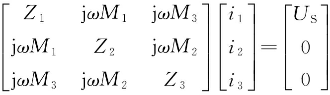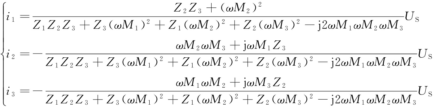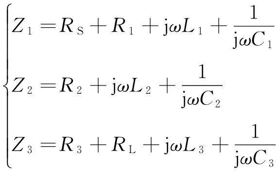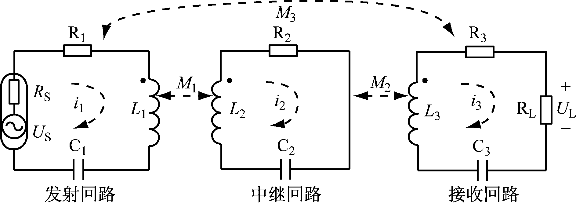 以1个串联补偿型三线圈WPT系统为研究对象,根据图1可建立三线圈WPT系统等效电路模型,如图2所示。图2中:UL为负载电压;i1,i2,i3分别为发射回路、中继回路、接收回路的高频电流;L1,L2,L3分别为发射线圈、中继线圈、接收线圈的电感;R1,R2,R3分别为发射回路、中继回路、接收回路的损耗电阻和辐射电阻之和;RS为高频电压源US的内阻;M1,M2,M3分别为发射线圈与中继线圈、中继线圈与接收线圈、发射线圈与接收线圈之间的互感。