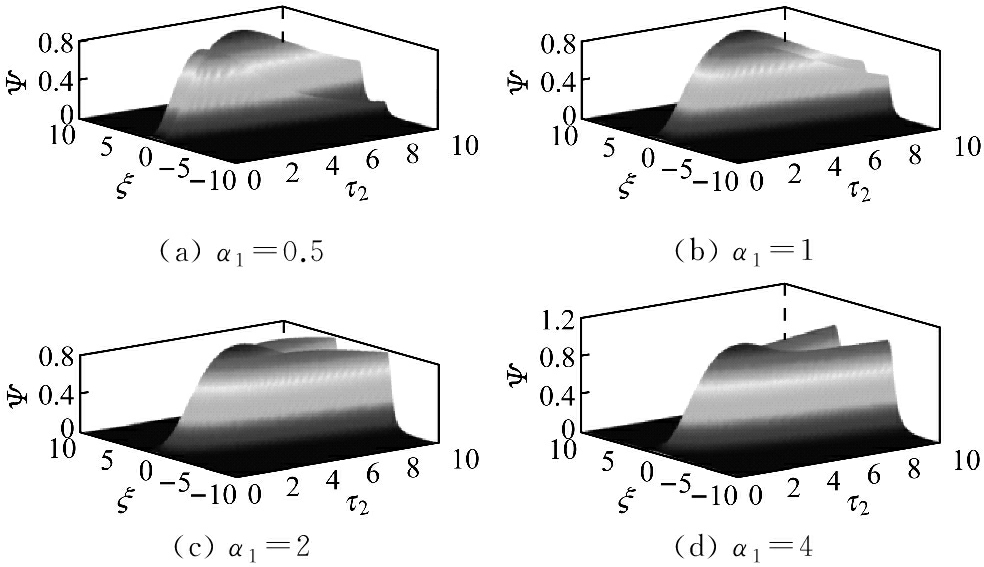 (2) 参数α1决定着系统本征频率ω0在过耦合区的系统输出功率增益变化趋势。当α1≤1时,有较大的系统输出功率增益,随着τ1与τ2取值的增大,系统输出功率增益以相对平缓的方式减小。当α1>>1时,中频ω0功率峰值快速减小而成为低频ω1功率峰值和高频ω2功率峰值之间的系统输出功率增益极小值。