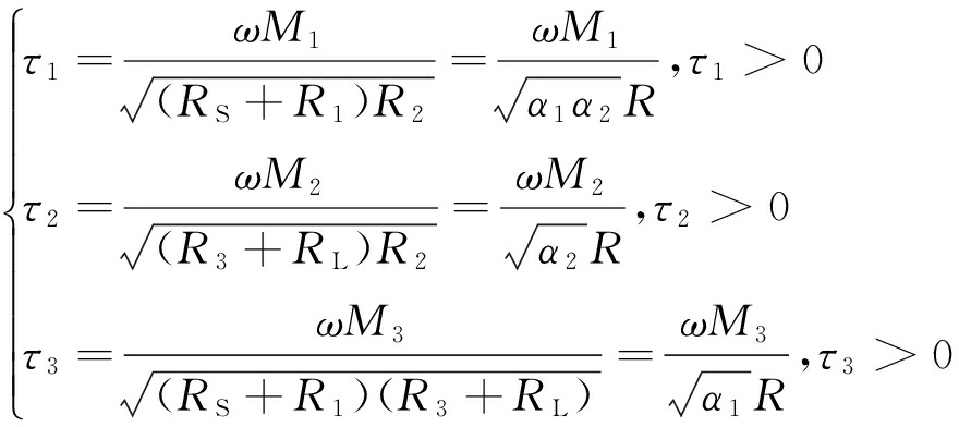 为了分析方便,令C1=C2=C3=C,R3+RL=R,RL=βR(β为负载阻抗比例因子),RS+R1=α1R(α1为发射回路与接收回路阻抗之比),R2=α2R(α2为中继回路与接收回路阻抗之比),L1=L2=L3=L,电路谐振角频率ω0=1/