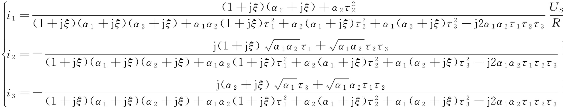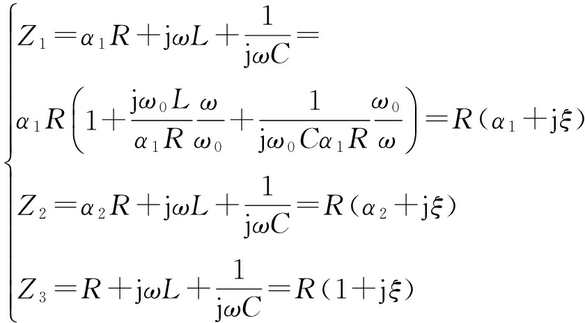 ,品质因数Q=ω0L/R=1/(ω0CR),引入广义失谐因子ξ,ξ=Q(ω/ω0-ω0/ω),则发射回路和接收回路的有载品质因数分别为Q1=ω0L/(RS+R1)=Q/α1,Q3=ω0L/(R3+RL)=Q,中继回路的无载品质因数Q2=ω0L/R2=Q/α2,则式(2)可进一步化简为