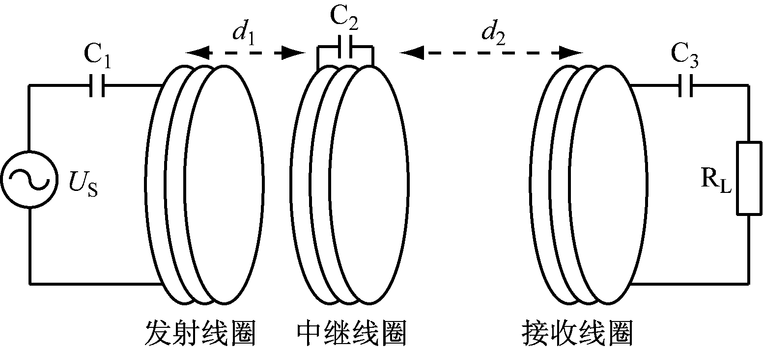 三线圈WPT系统结构如图1所示,其中US为高频电压源;C1,C2和C3分别为发射线圈、中继线圈和接收线圈回路的补偿电容(包括外加电容和寄生电容);RL为负载电阻;d1,d2分别为发射线圈与中继线圈、中继线圈与接收线圈之间的耦合距离。三线圈结构与两线圈结构相比,主要区别是在发射线圈和接收线圈之间增加了1个中继线圈。三线圈均为空心螺旋线圈,由于3个线圈在高频时会产生自感和寄生电容,通过外加谐振补偿电容可使线圈的谐振频率和高频电压源频率相同,从而使得系统发生谐振,实现无线电能传输。