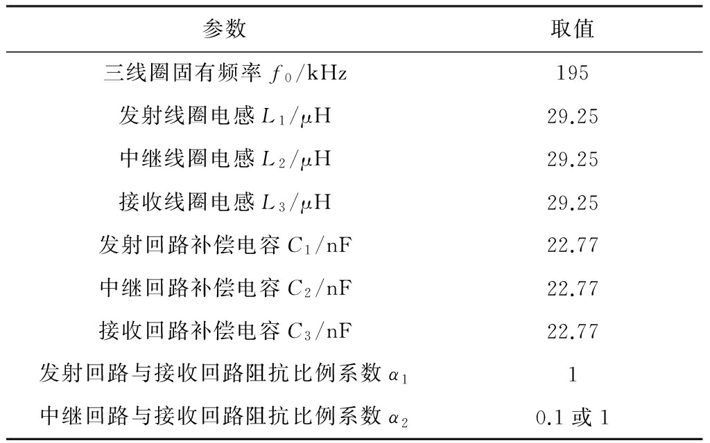 为了验证理论分析的正确性,构建了三线圈WPT实验系统,实验装置如图9所示。测试仪器及相关设备主要为电压可调的直流稳压电源、TH2829C型电桥分析仪、电压探头、P6022型电流探头和DS1054A型四通道数字示波器等。信号发生器生成的信号经功率放大器放大后送入谐振发射回路,经中继回路的谐振耦合、接收回路的谐振耦合后供负载使用。WPT系统的主要参数见表1。