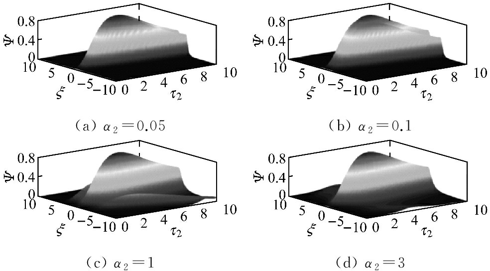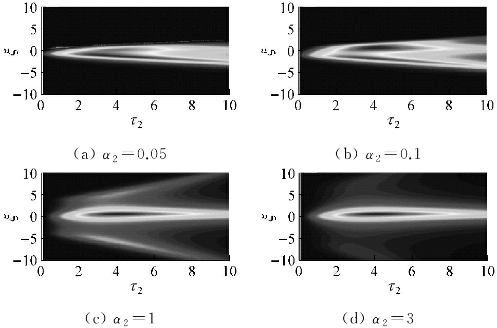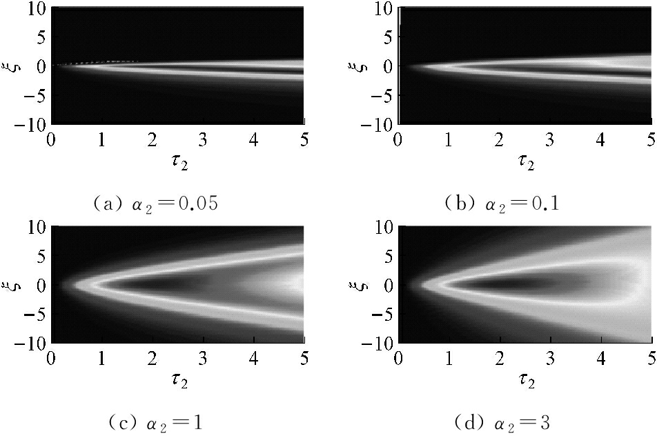 处,存在传输效率分裂现象,在分裂的2个频率上可取得传输效率峰值。α2取值越大,传输效率的2个峰值分裂越严重。因此,α2取较小值有利于抑制传输效率的分裂。在τ2<±