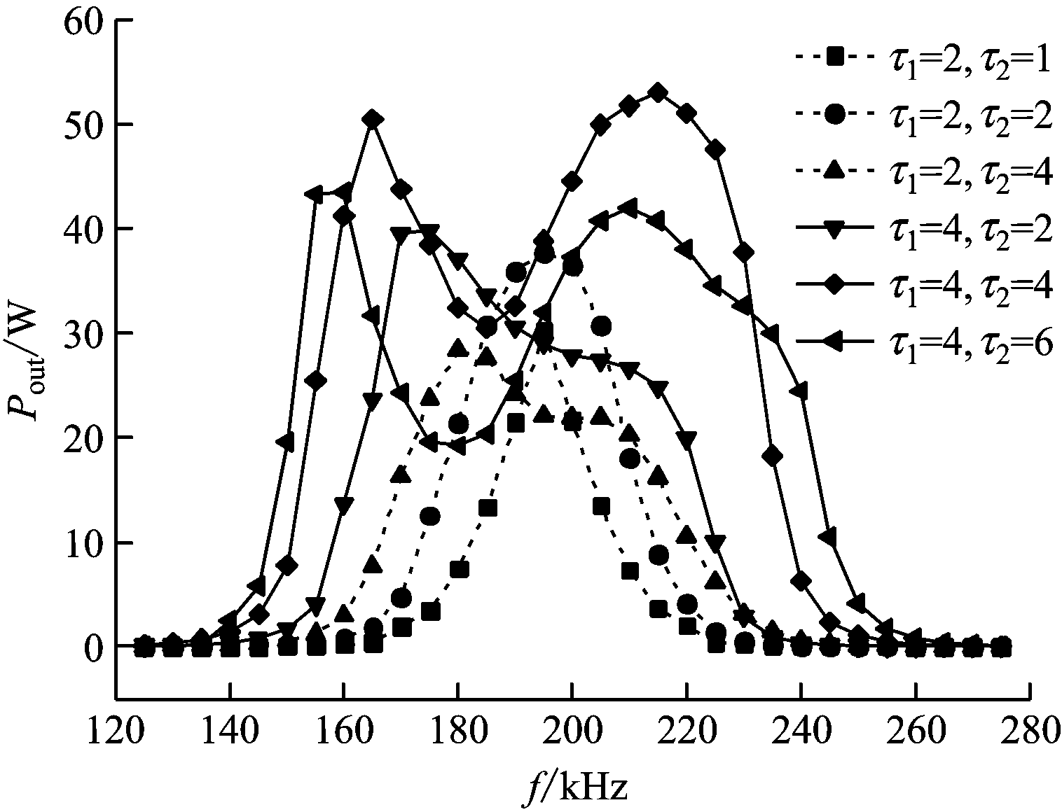 从图10可知,在2组实验数据中,系统输出功率最大值在τ1=τ2=2或τ1=τ2=4处取得。受τ3的影响,在第1组数据(τ1=2,τ2=1,2,4)中,系统输出功率为单峰值,其峰值中心频率随着τ2的增大,向低频方向增大并偏离系统固有频率ω0(即f0=195 kHz);在第2组数据(τ1=4,τ2=2,4,6)中,当τ1=4,τ2=2时,系统输出功率为单峰值,但峰值中心频率偏离系统固有频率ω0。当τ1=4,τ2=4,6时,系统输出功率为双峰值,低频功率峰值中心频率ω1向低频方向发生了漂移,高频功率峰值实为中频ω0功率峰值和高频ω2功率峰值融合而成,中频ω0功率峰值向高频方向发生了漂移,高频ω2功率峰值向低频发生了漂移。由第2组实验数据可知,系统输出功率发生了完全分裂,该实验结果很好地验证了理论分析和图6(b)仿真结果的正确性;如果τ3的影响可忽略不计,例如,在满足α1=1,α2≈0.5,τ1=4,τ2>4的条件下,实验中可明显地观察到3个功率峰值。