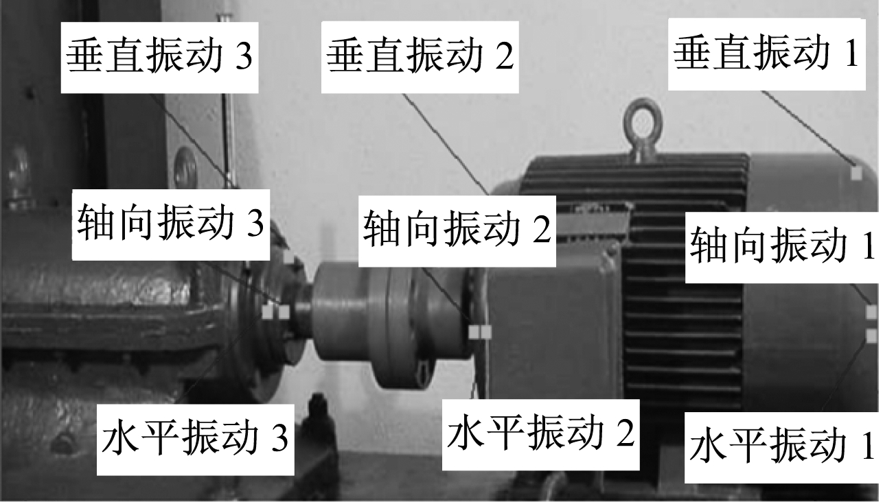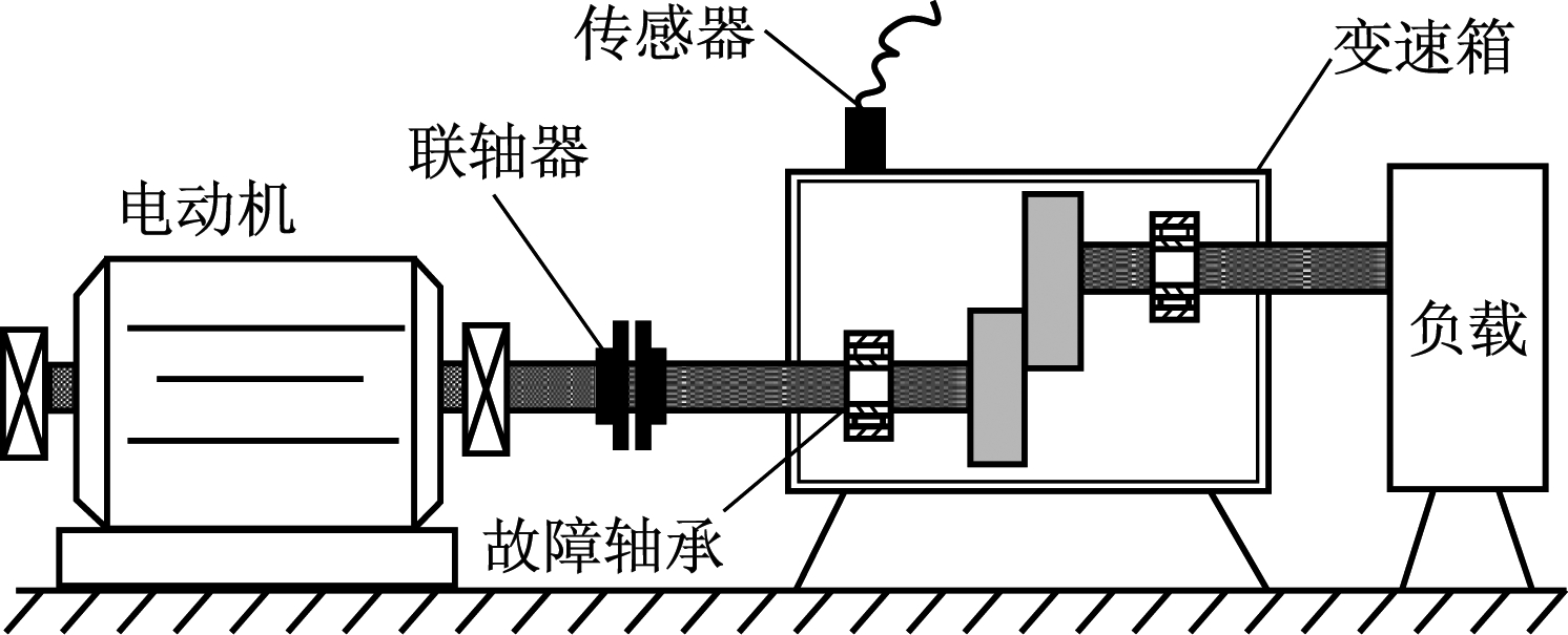 实验采用变速箱轴承故障信号,故障轴承为6205型深沟球轴承。利用电火花在输出轴承的内圈沟道、外圈沟道和滚珠中分别设置面积约为2 mm2的点蚀,分别对应轴承内圈故障、外圈故障和滚动体故障。变速箱装置简图如图2所示,实际用于信号采集的传感器布置如图3所示。变速箱运行时,轴的转速约为1 750 r/min(频率fr=29.17 Hz),负载为25 N·m;通过B&K3560数据采集仪采样,采样频率为1.2 kHz,滚动轴承振动信号采自变速箱轴承座的垂直振动信号。实验采集轴承4种故障状态下的振动信号样本,每种状态采集100个样本,每个样本长度为823。