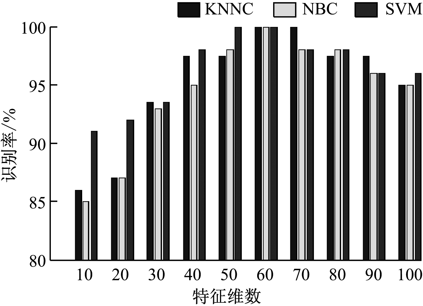 从图5可知,当R取60时,3种方法的识别精度均可达100%,随着R的增加,识别精度有所下降。这是因为,当R取值过小或过大时,提取的特征维数都不能充分反映系统的复杂度,这2种情况均不利于分类识别。因此,在利用LNMF提取图像特征参数时,可根据故障诊断的具体需求合理设定特征维数。