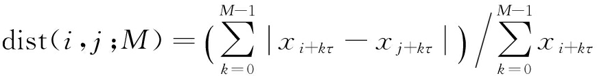 给定离散时间序列{xi,i=1,2,…,N}(N为离散时间序列长度),通过延时常数τ和嵌入维数M来进行伪相空间重构,第i点Yi的表达式为