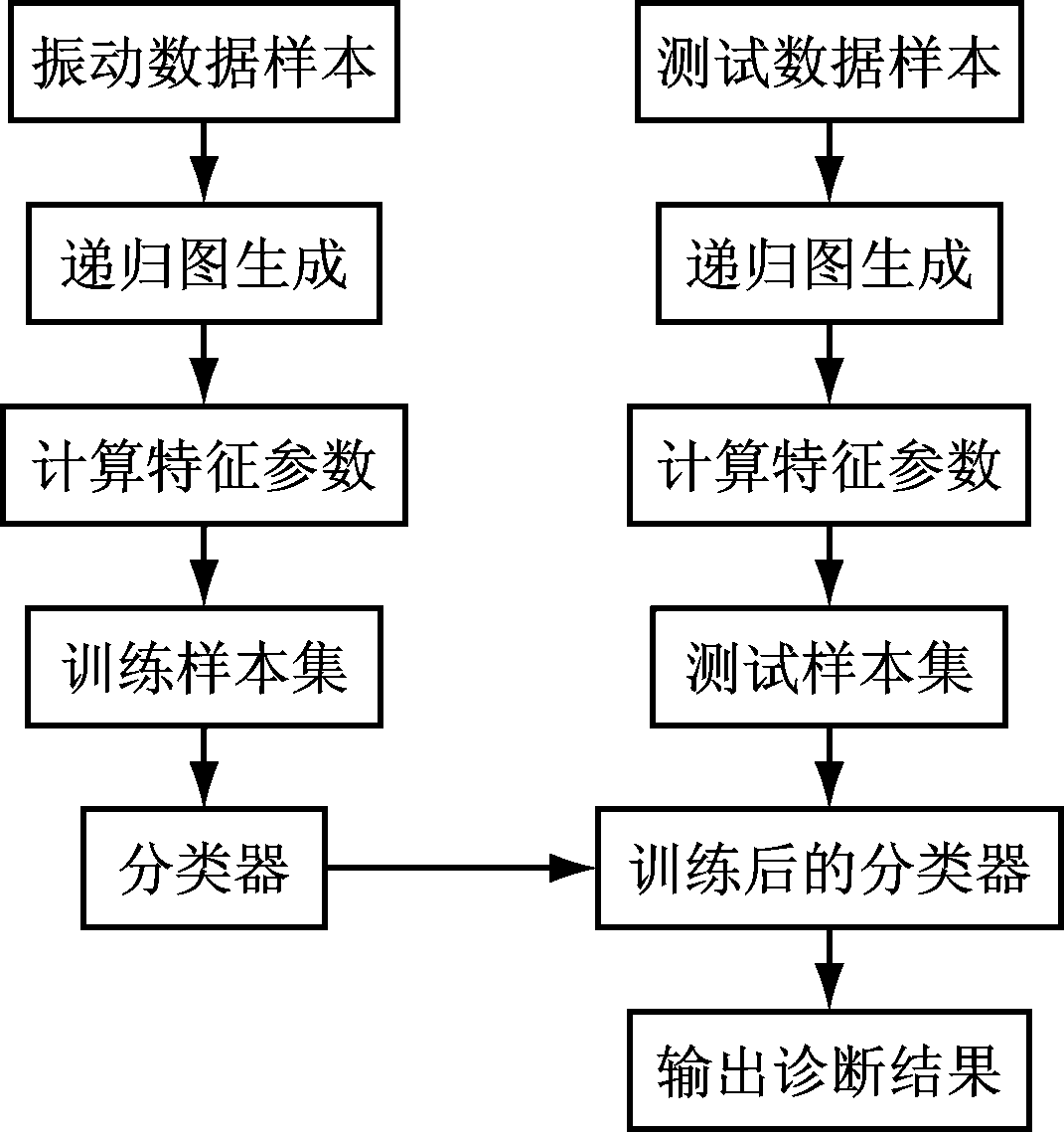 基于RP与LNMF的故障诊断流程如图1所示。首先根据采集到的轴承振动信号生成RP;然后采用LNMF方法对生成的RP进行特征参数提取,从中选取能够有效表征轴承工作状态的特征参数向量,并用这些向量训练分类器;用训练好的分类器对待分类特征参数进行分类识别,完成对轴承的故障诊断。