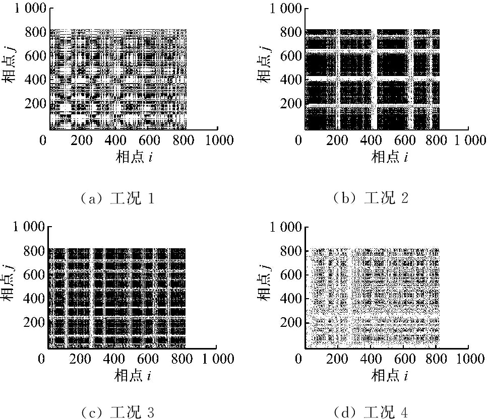 取阈值r=0.25×distmax时轴承处于正常状态(工况1)、内圈故障状态(工况2)、外圈故障状态(工况3)、滚动体故障状态(工况4)4种工况下的RP,如图4所示。从图4可以看出,信号的RP能反映系统运行时的复杂程度,并有很好的鲁棒性。