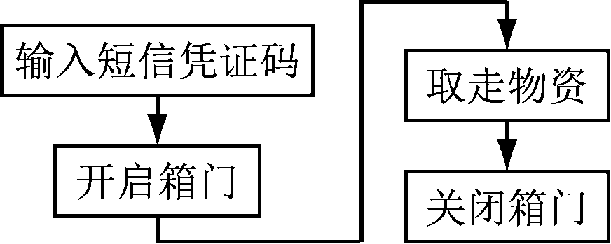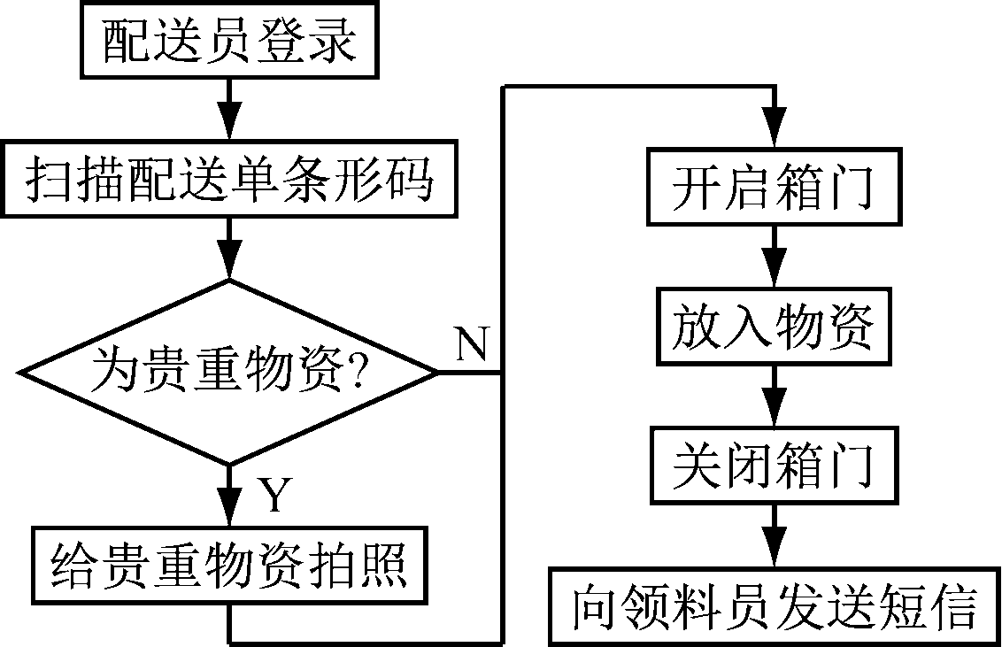 (3) 安排配送员携带物资和配送单去终端智能柜进行物资配送,配送完成后系统自动发送短信到区队领料员的本质安全型手持终端上。物资配送流程如图6所示。