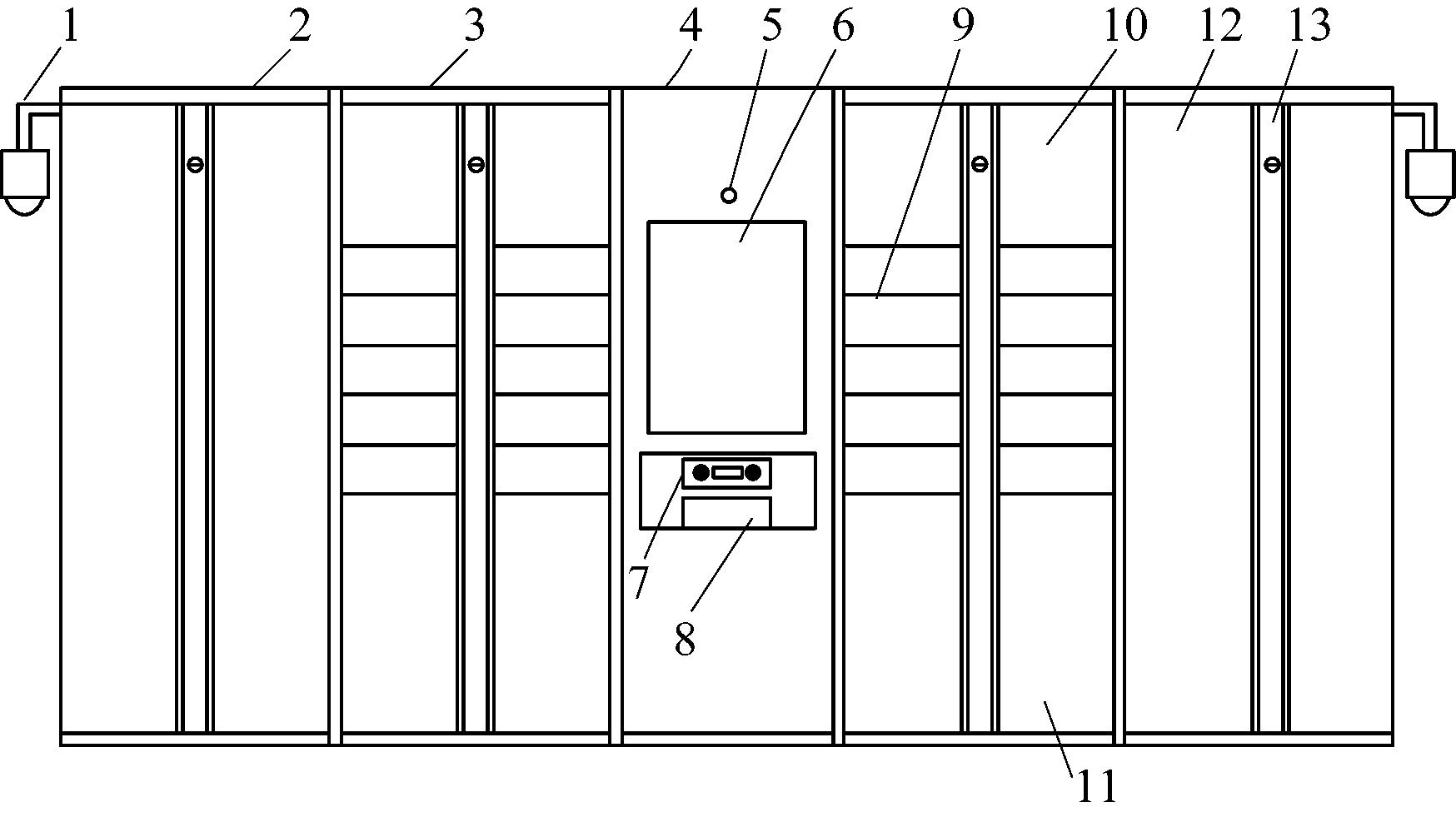 1-球型摄像头; 2-储物柜(类型1); 3-储物柜(类型2);4-主机柜; 5-USB摄像头; 6-红外触摸屏; 7-扫描枪; 8-刷卡器;9-小箱; 10-中箱; 11-大箱; 12-超大箱; 13-条形板