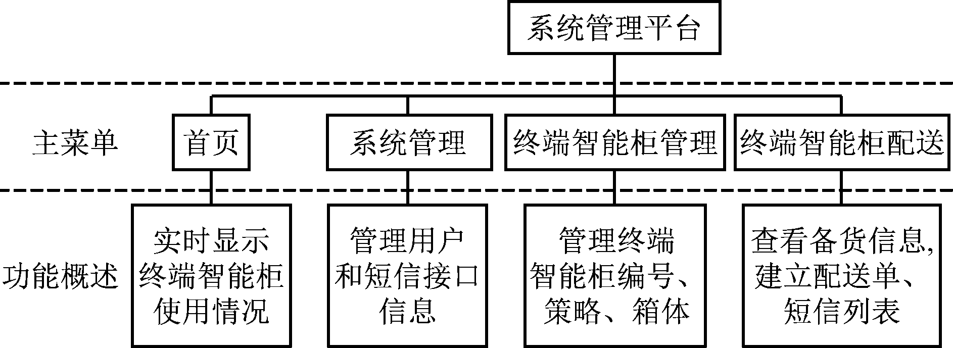 (2) 人机对话功能。系统管理平台可设置和修改终端智能柜参数,如柜体数量、大小柜比例、终端智能柜开关机时间等;可设置管理员、配送员、领料员的信息,可进行操作权限管理和操作记录;可设置和修改终端智能柜位置图;可调用远程开箱功能。