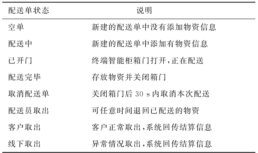 (1) 智能监控功能。系统管理平台可实时监控物资配送情况,并实时显示每一环节的配送单状态(表1);可实时显示终端智能柜箱体的使用情况,包括空箱及满箱数量;可查看终端智能柜拍摄贵重物资时上传至系统管理平台的配送凭证。