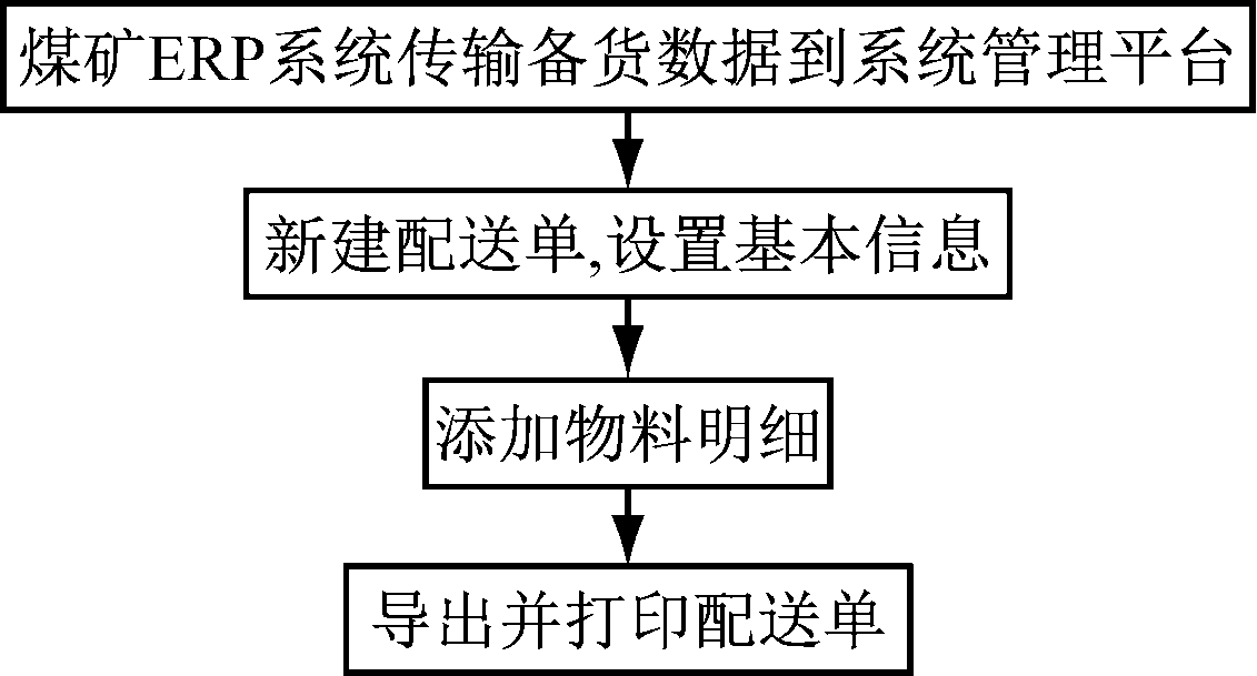 (2) 在ERP系统上,管理员对调拨预留进行出库,并自动传输数据到系统管理平台上生成备货信息。配送员在系统管理平台上新建配送单,设置配送单的配送员、领料员、箱体类型、物资是否贵重、移库数量等基本信息,添加备货信息到配送单,完成配送单设置,将其导出并打印。配送员根据配送单信息对调拨物资进行拣配分装。配送单生成流程如图5所示。