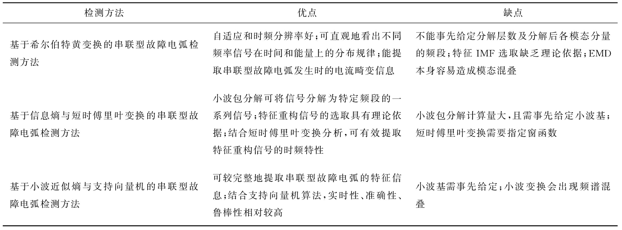 对基于希尔伯特黄变换、信息熵与短时傅里叶变换、小波近似熵与支持向量机的串联型故障电弧检测方法的优缺点进行比较,见表2。基于希尔伯特黄变换、信息熵与短时傅里叶变换的串联型故障电弧检测方法均提取各自特征信号的时频信息,针对时频谱幅值设置合适的阈值即可作为串联型故障电弧检测的依据,但由于EMD算法本身缺陷和小波包较大的计算量,识别的准确性和实时性不高。基于小波近似熵与支持向量机的串联型故障电弧检测方法直接提取小波分解后各重构信号的近似熵作为支持向量机的输入进行识别,相对前2种方法具有更高的准确性和实时性,更适合现场应用。