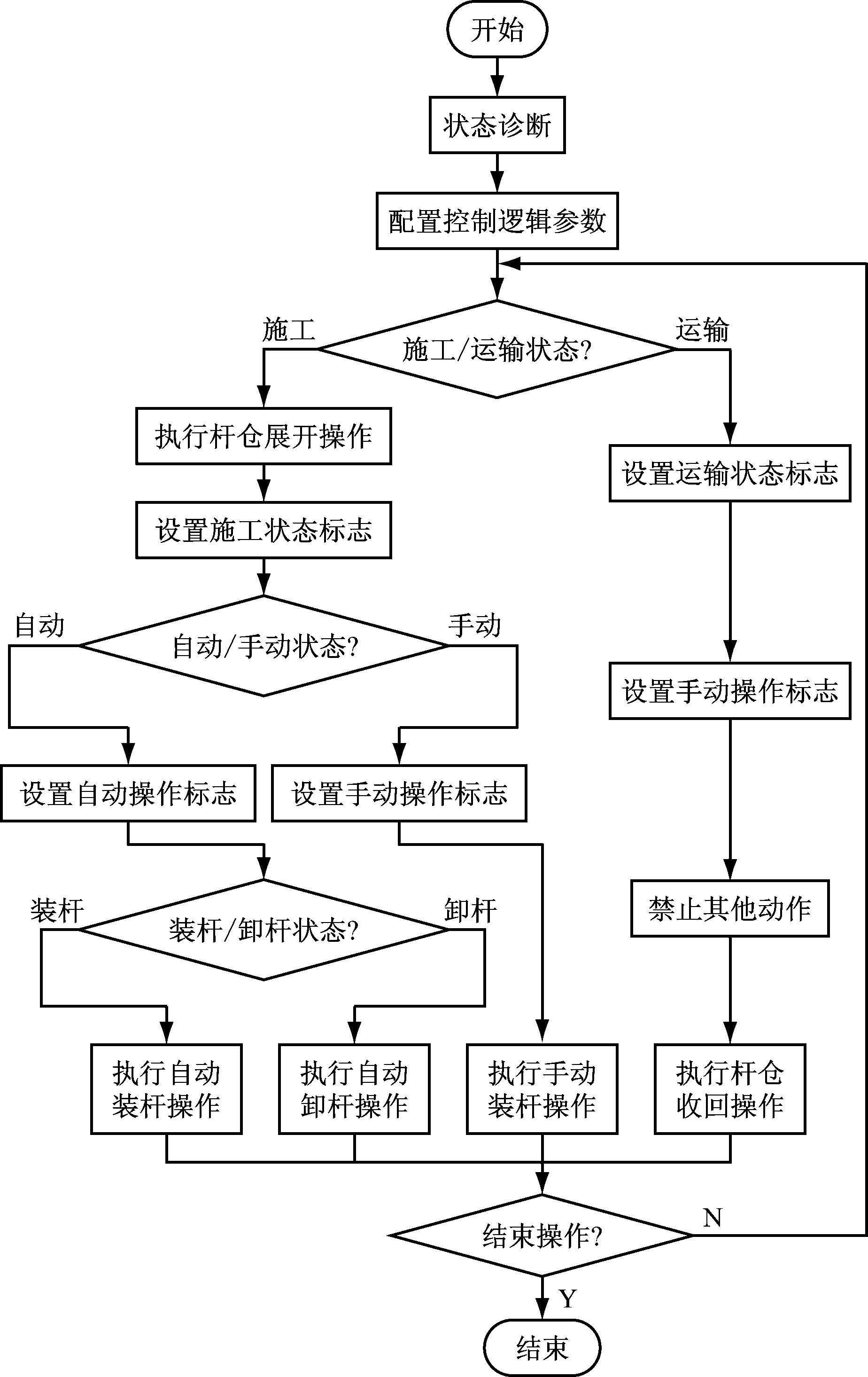 控制系统软件利用CodeSys V3 PLC软件编程平台开发,该平台的程序编辑器和调试器的功能是建立在高级编程语言的基础上,功能强大,开发便捷。设计控制程序时,应考虑到不同的钻机工作状态对应着不同的动作,各种状态存在动作互锁的关系,如钻机动力头动作时,换杆装置不能动作,以防止发生碰撞。另外,各种工作状态的检测也应考虑优先级的不同,以进一步提高动作的安全性。结合控制系统的硬件结构及钻探施工流程设计的控制系统软件流程如图5所示。