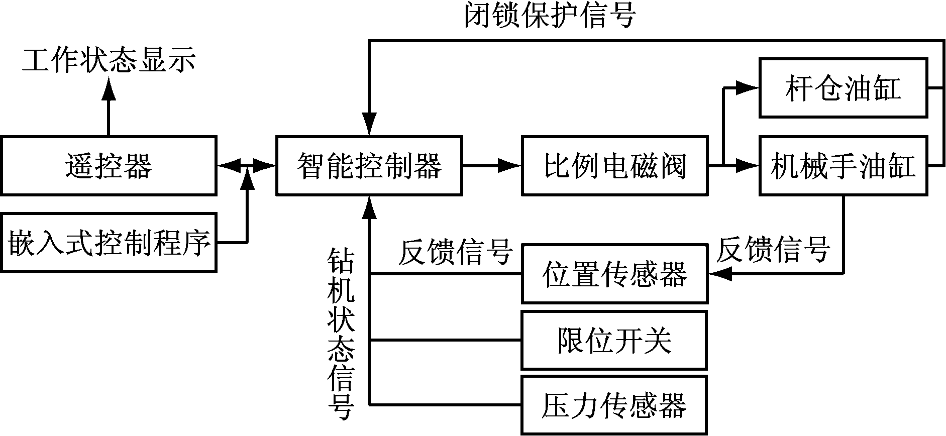 目前,智能控制器在工程机械的电液控制系统中逐渐得到推广应用。这种控制器相对于过去的可编程逻辑控制器(PLC),具有更加强大的计算能力,可以进行智能控制计算;具有更加强大的驱动能力,不需要继电器的配合,就可以直接输出大电流去控制电磁阀;具有更加紧凑的结构和丰富的硬件接口。本文利用某公司的智能控制器进行隔爆设计,并进行电气隔离保护设计,开发了矿用本质安全兼隔爆型液压控制器。该控制器集成度比PLC高,适应性更强,并且功耗也比较低,可以应用于井下绝大部分设备的电液控制[10-11]。本文以该控制器为核心,设计了换杆装置控制系统,其结构如图4所示。