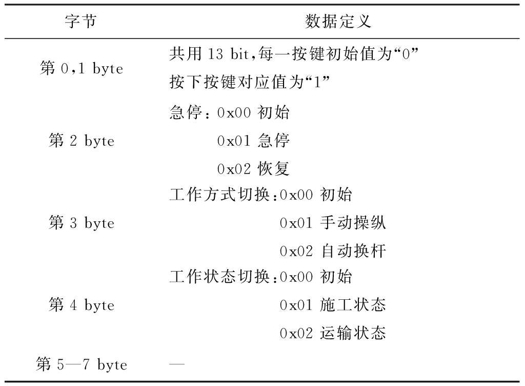 控制器与遥控器之间通过CAN总线进行双向通信,遥控器发送的操作信息CAN ID为0x181,控制器发送的状态信息CAN ID为0x182,CAN总线波特率为250 kbit/s。其中,操作信息占用CAN总线数据场8 byte中的前5 byte,根据操作逻辑和相应的按键定义,遥控器发送的操作信息报文定义见表1。其中,第0,1 byte的每一位对应着遥控器的按键,能够实现对换杆装置的运动控制。第2—4 byte对应的按键为多功能按键,可以实现多种操作状态的切换。