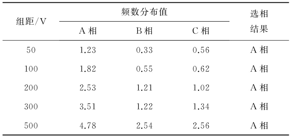 设线路L2的A相发生接地故障,故障点距母线3 km,故障合闸角为35°,接地电阻为800 Ω。在组距范围内,选取不同的组距值进行仿真,结果见表5。由表5可知,在不同的组距下,根据最大频数分布值能准确选出故障线路,说明组距的选取对选相没有影响。