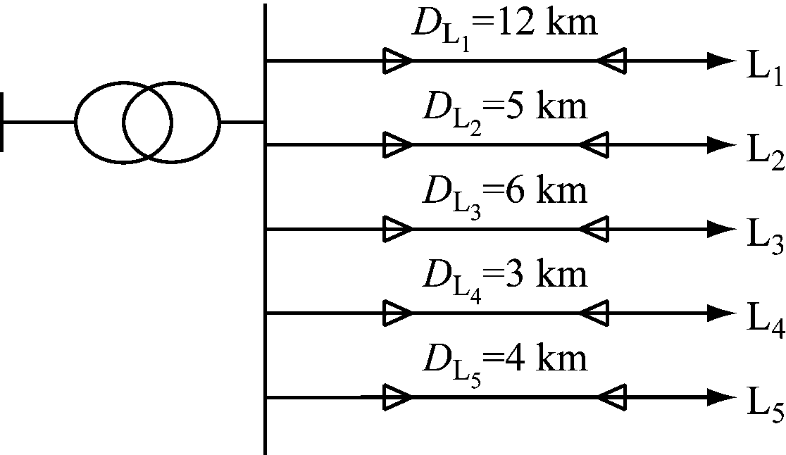 利用Matlab建立不对称中性点不接地接地系统单相接地故障仿真模型[10-14],该配电网的母线电压为10.5 kV,引出5条线路,如图5所示。图5中,DL为电缆线路长度。