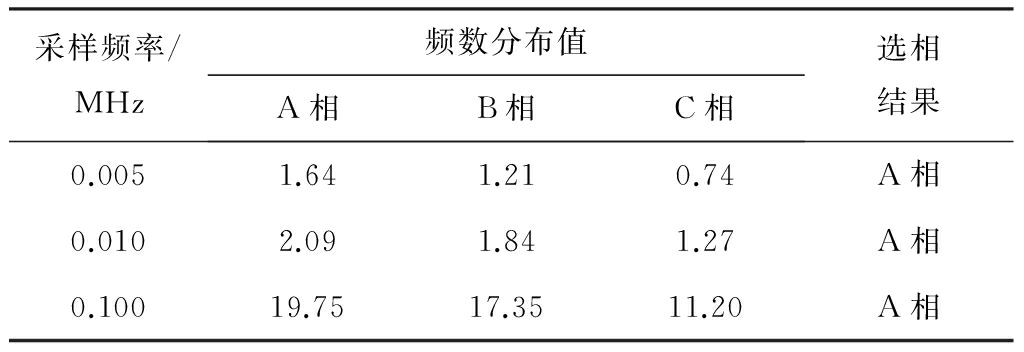由图6可得,A相的频数分布趋势起伏最大,而B,C两相的频数分布趋势较平缓,凭借这一特征很容易选出故障相A,这与前文提出的选相原理完全一致。为更确切地表征故障相与非故障相的频数分布区别,求出相应的频数分布值:6.157,1.215,1.173。由此可得,通过比较频数分布值可以选出故障相。