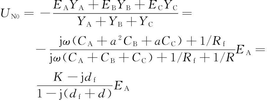 设EA,EB,EC为三相相电压;YA,YB,YC为三相对地导纳;UA,UB,UC为三相对地电压;UN0为中性点对地电压。选取A相相电压EA作为参考相位,则三相对地电压分别为