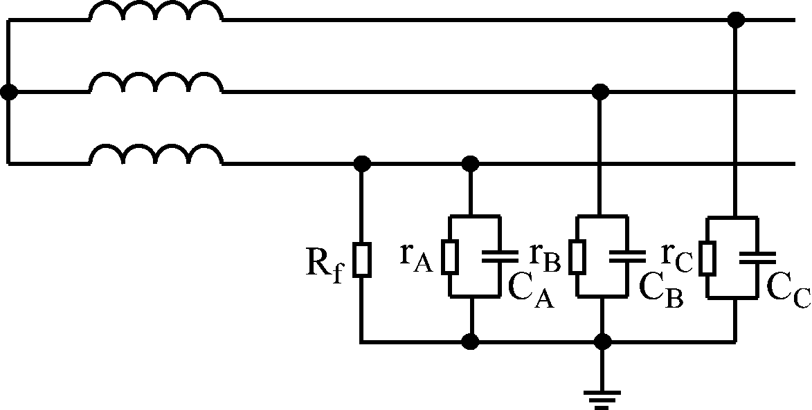 实际应用中,电网不对称是普遍存在的。不对称中性点不接地系统经过渡电阻接地时的简化图如图1所示[4-5]。图1中,rA,rB,rC分别为电网的三相对地绝缘电阻;CA,CB,CC分别为三相对地电容;Rf为故障点接地电阻值。