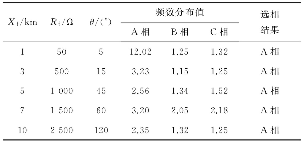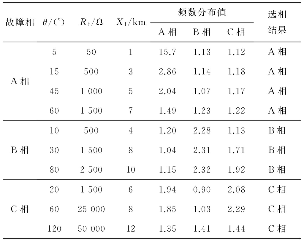 分别设定线路L1的A相、B相、C相发生接地故障,对不同故障工况进行大量仿真分析。限于篇幅,表1列出了几种典型故障工况下的仿真结果。在接地电阻为1 000 Ω以上的故障工况中,根据最大频数分布值能准确选出故障相,在其他故障工况下,也能准确选出故障相,说明了该选相方法适用于高阻接地的情况,同样也适用于低阻接地的情况。